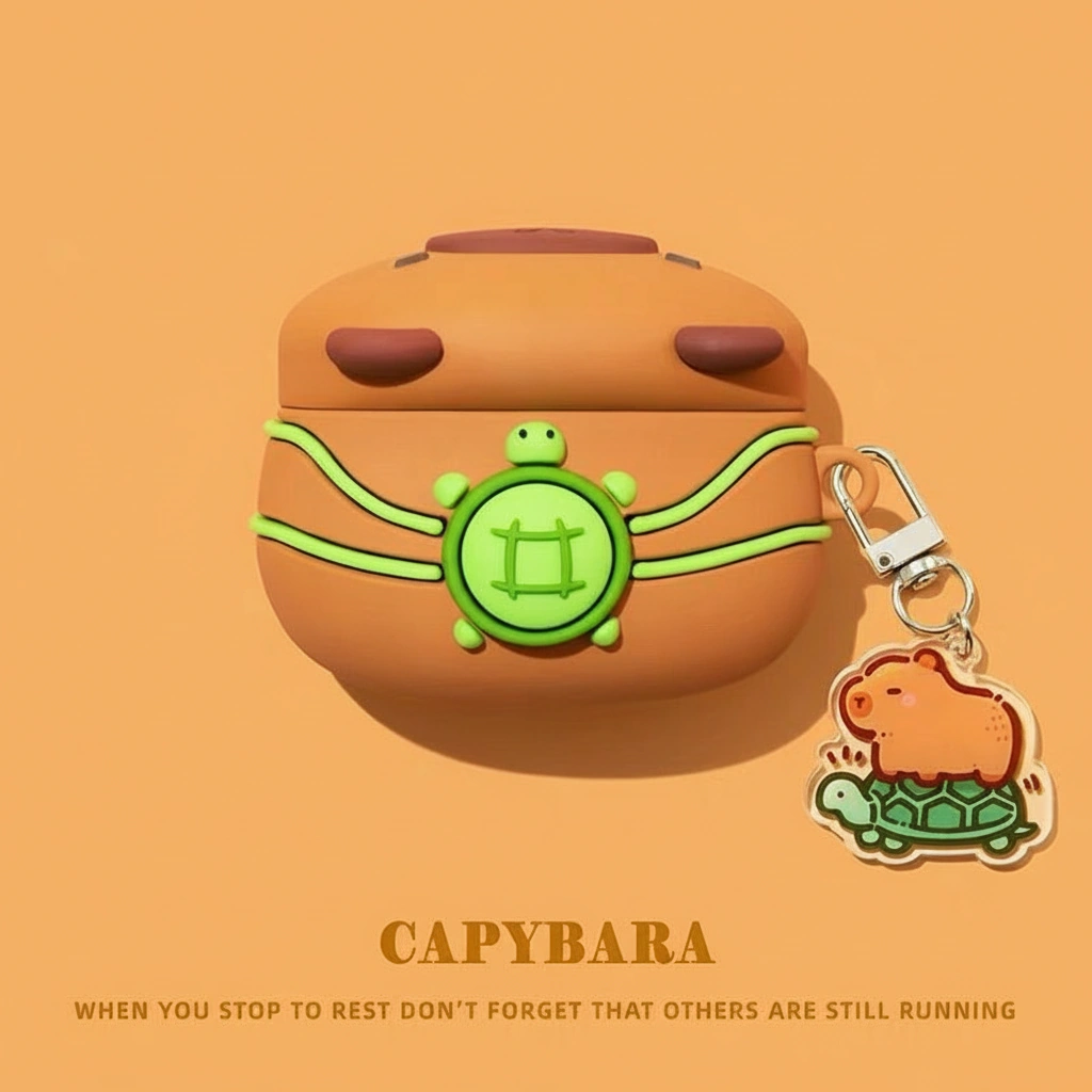 Slow and Steady Wins the Cuteness Race Get ready for daily adventures with the most iconic animal friendship duo. This isn’t just protection for your earbuds; it’s a celebration of chill vibes. Crafted from smooth, durable silicone, this capybara AirPods case features our favorite rodent proudly wearing a green turtle as a backpack, complete with wraparound straps. It’s rugged cuteness ready for your bag or pocket.