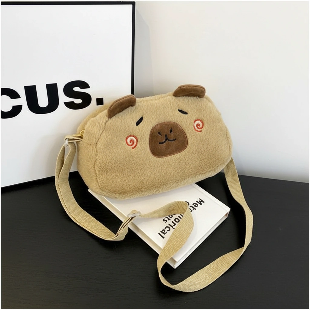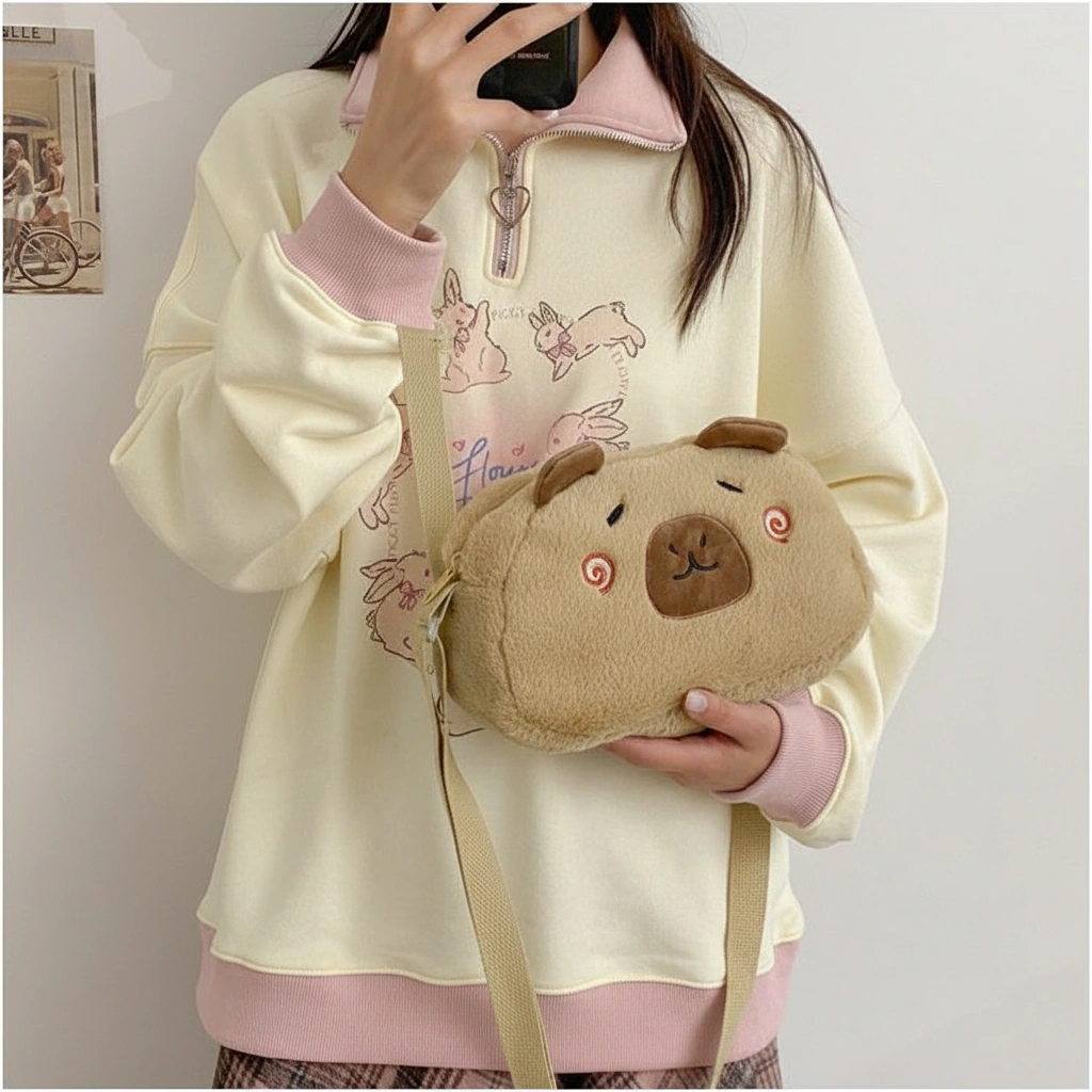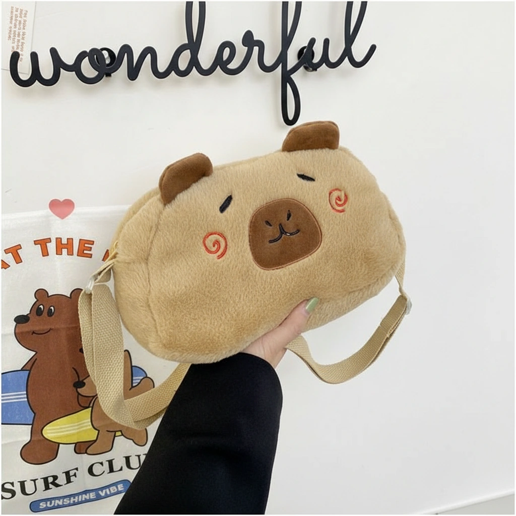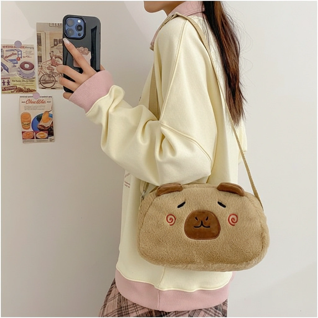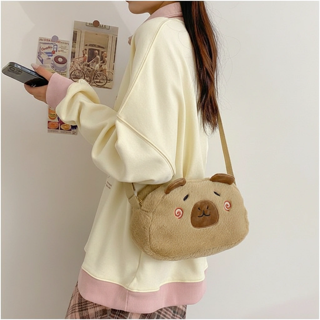 A Soft Touch of Blush Wrap yourself in cozy vibes with this ultra-soft Capybara Plush Crossbody Bag. Designed in a creamy beige hue, this bag stands out with its adorable “blushing” face details. It’s the perfect accessory for adding a gentle, playful touch to your casual outfits, whether you are heading to a coffee shop or a study date.