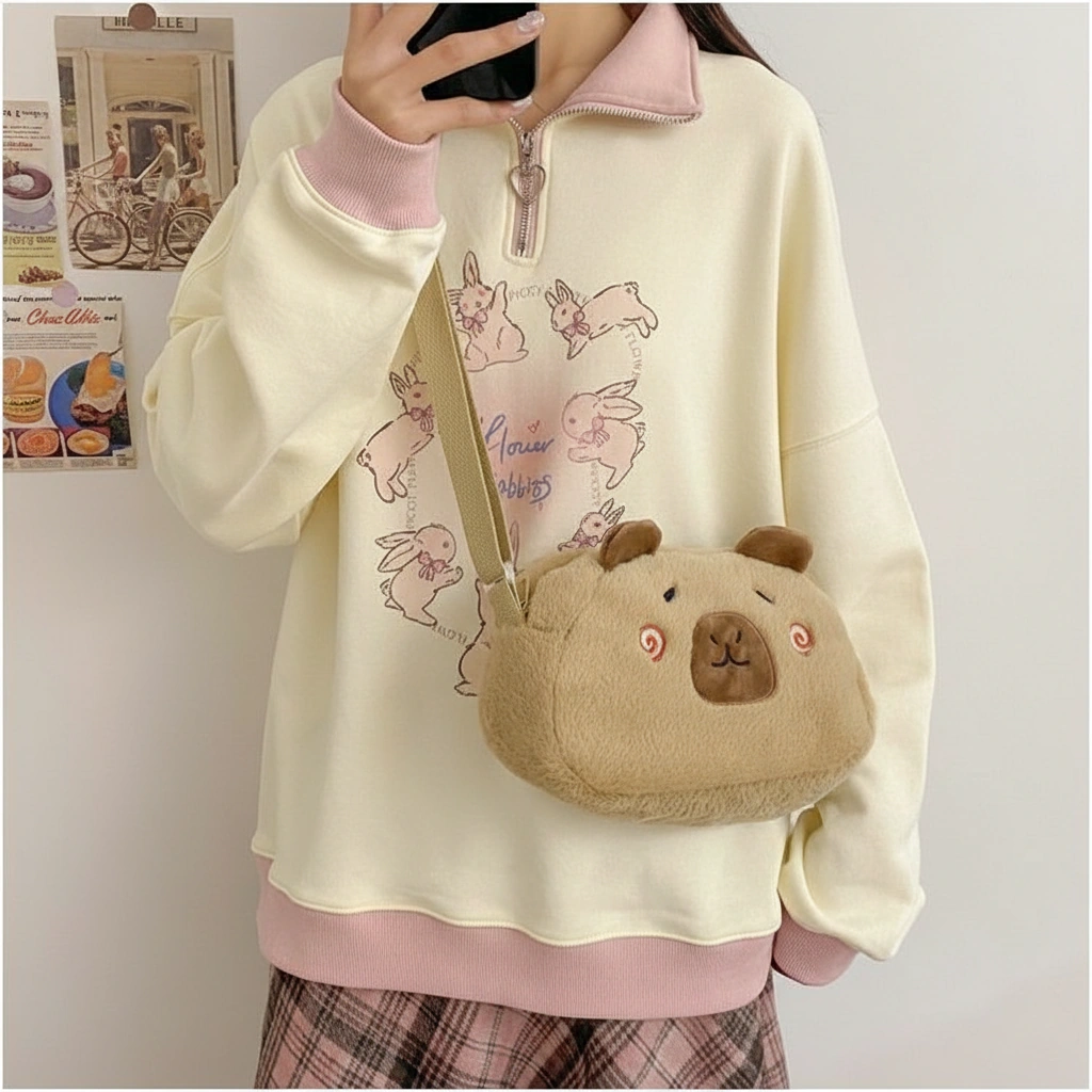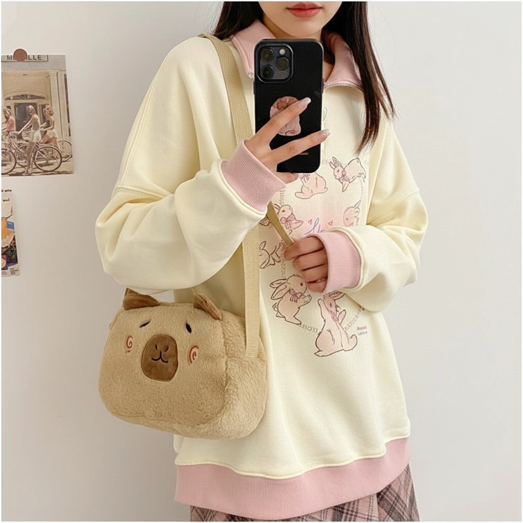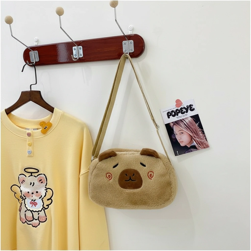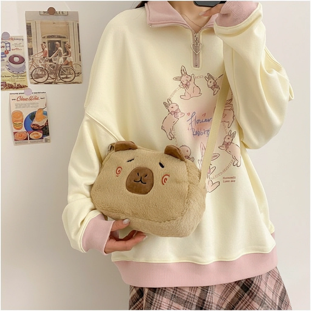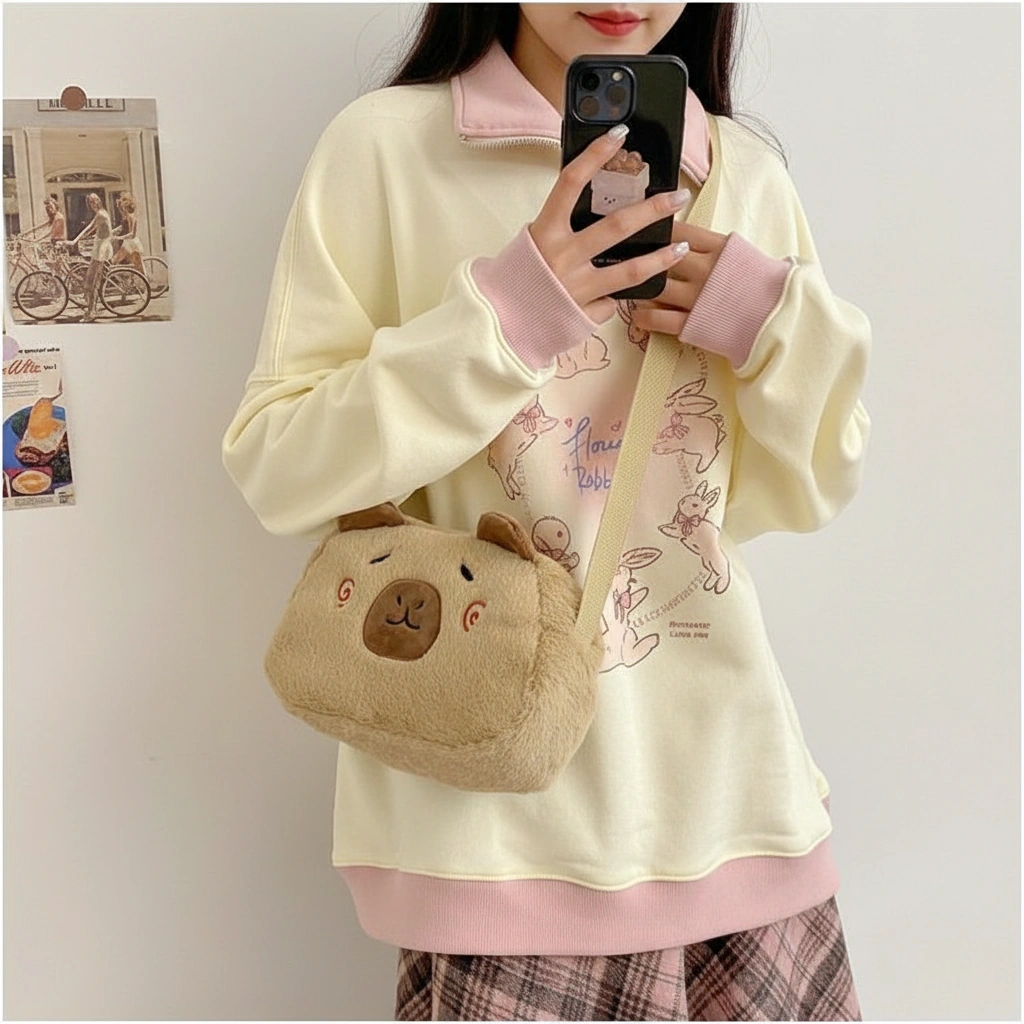 A Soft Touch of Blush Wrap yourself in cozy vibes with this ultra-soft Capybara Plush Crossbody Bag. Designed in a creamy beige hue, this bag stands out with its adorable “blushing” face details. It’s the perfect accessory for adding a gentle, playful touch to your casual outfits, whether you are heading to a coffee shop or a study date.
