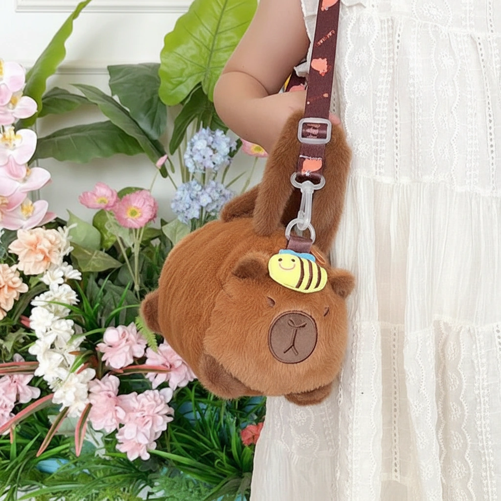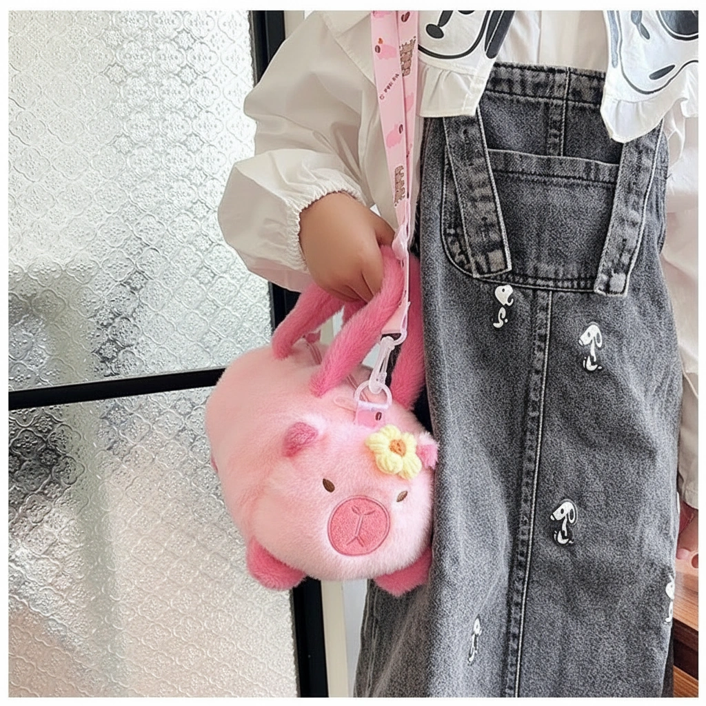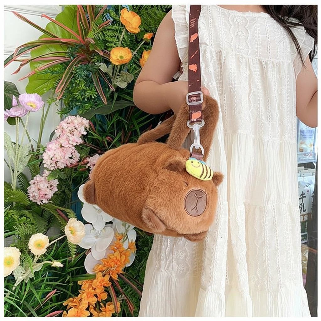- Dual Carry Options: Carry it by the soft, plush-wrapped top handles for a cute handbag look, or attach the patterned shoulder strap (printed with mini cartoon capybaras) to wear it comfortably as a crossbody.