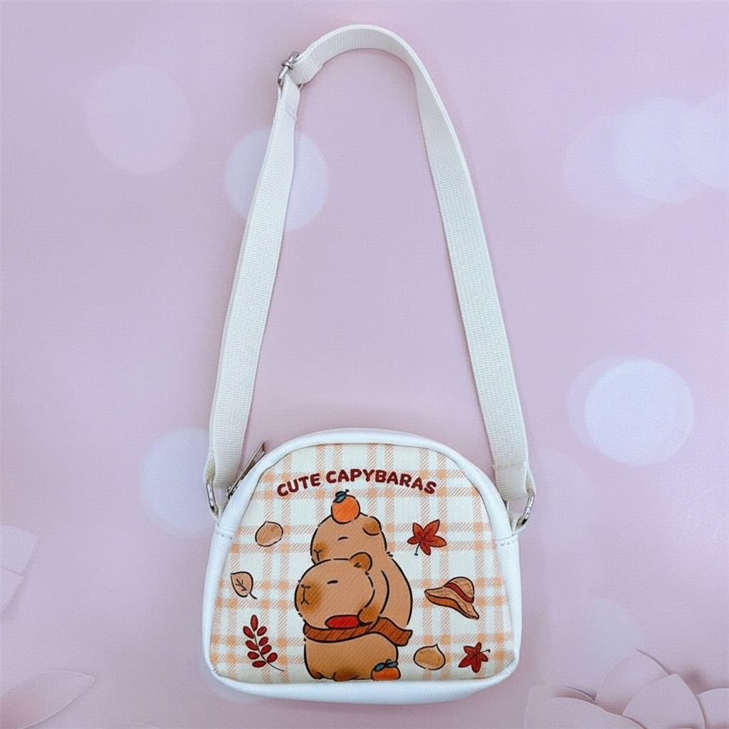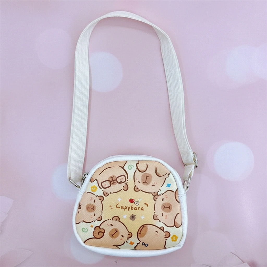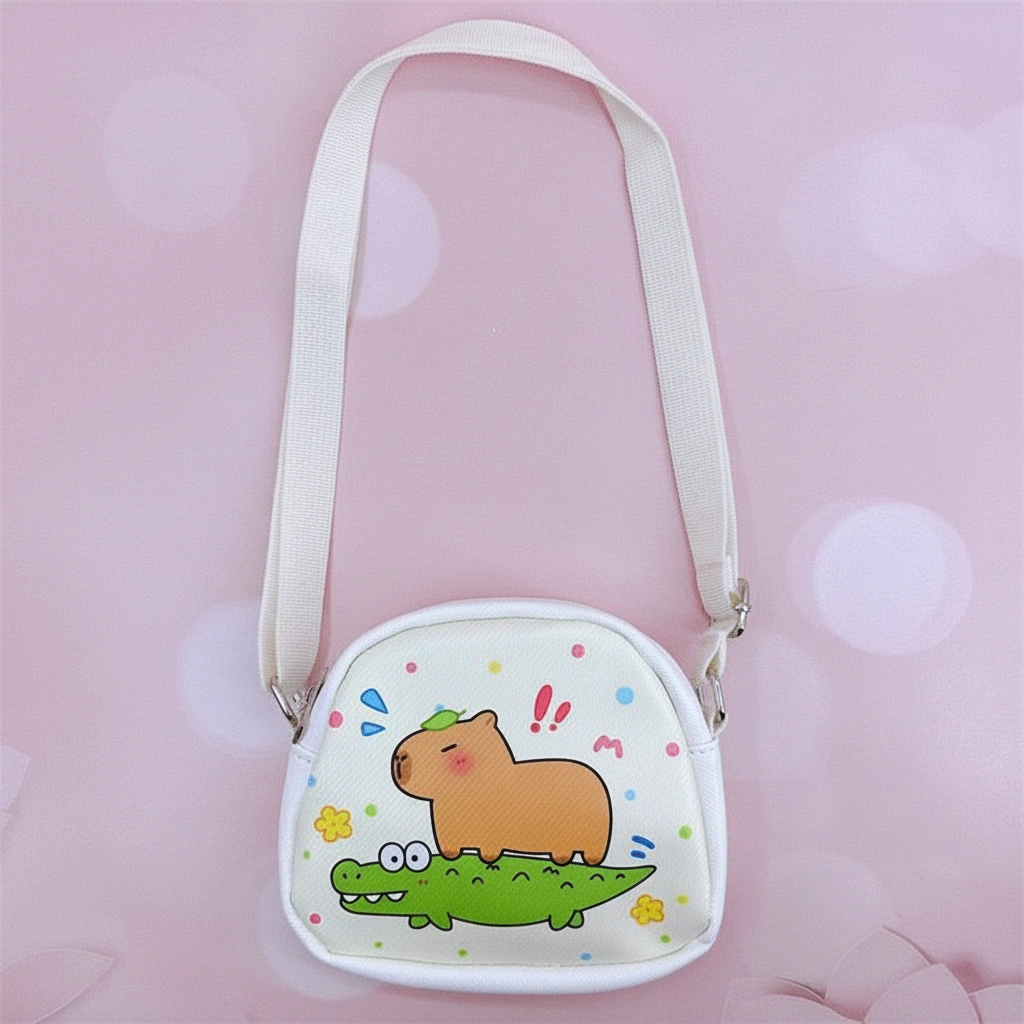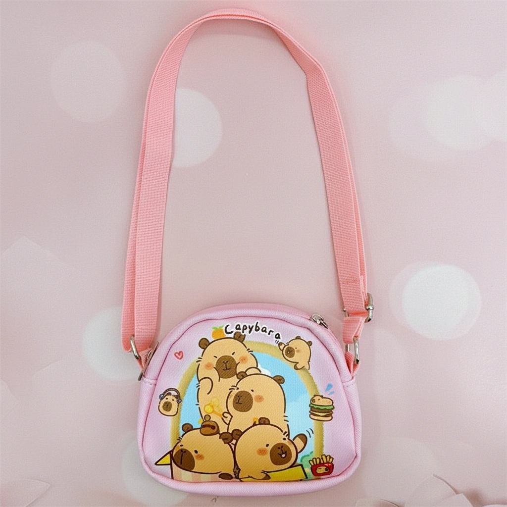 Tiny Bags for Big Imaginations Give your little one a stylish place to stash their treasures with this adorable Kids Mini Capybara Purse. Perfectly sized for toddlers and young children, this semi-circular bag is lightweight, easy to wipe clean, and features vibrant cartoon prints of everyone’s favorite chill animal. Whether they are packing a lip balm, a toy car, or a few coins, this bag makes every outfit cuter.