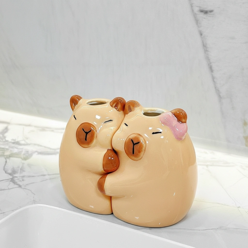 Capybara Couple Toothbrush Holder Set – Ceramic Hugging Stands (Pair)