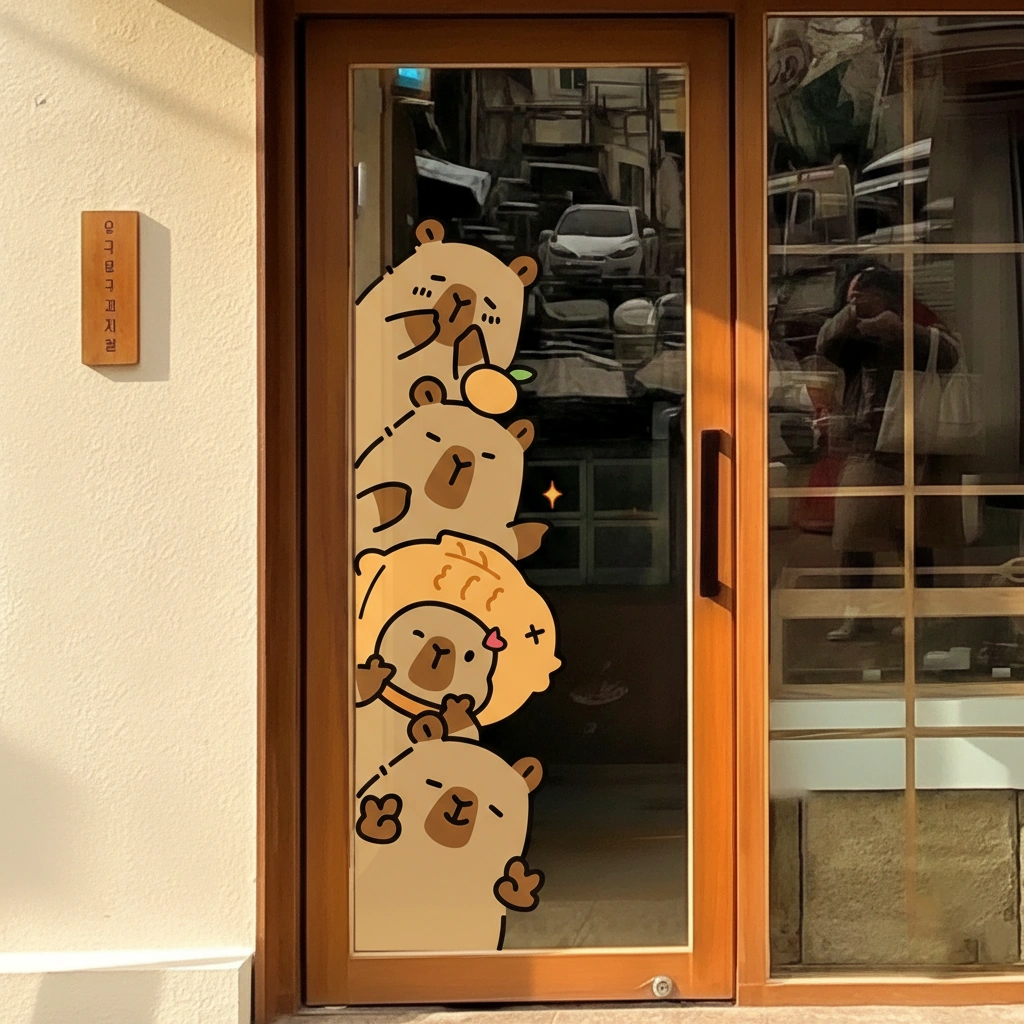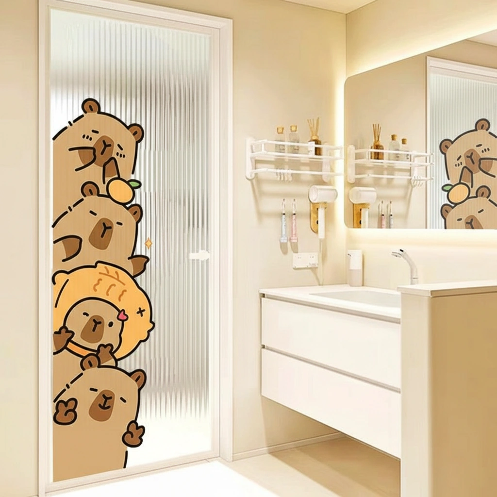 Who needs a boring frosted door when you can have a stack of chill capybaras guarding your privacy? This adorable static window cling features our favorite zen friends peeking around the edge of your glass door—complete with a spa towel and a yuzu orange on their heads.