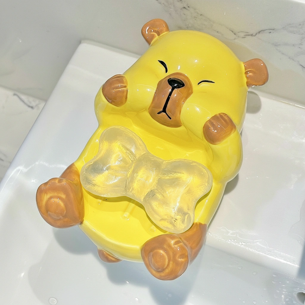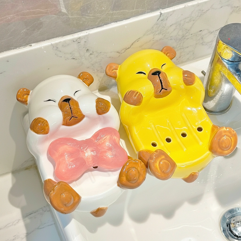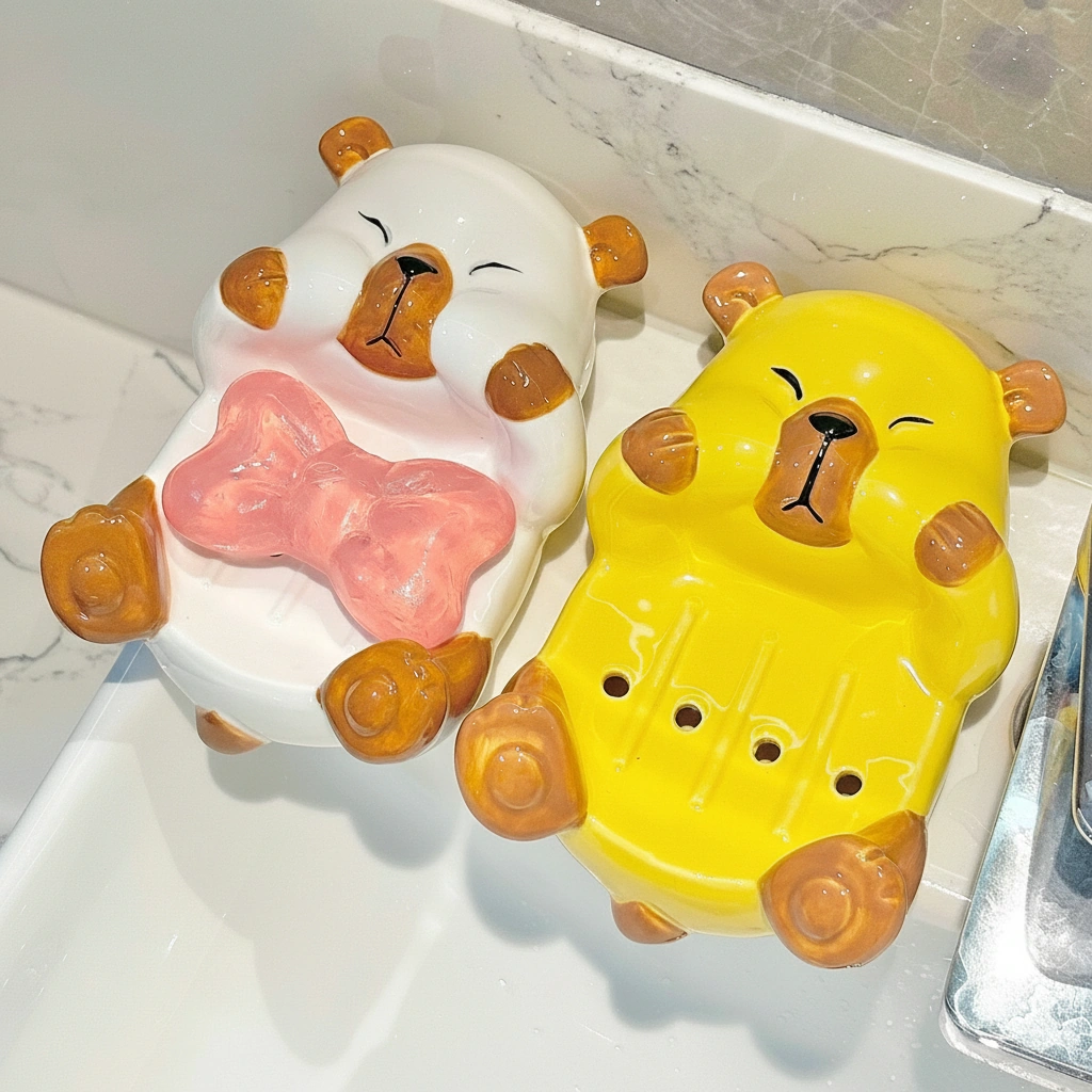 Chubby Ceramic Capybara Soap Dish – Belly Up Holder with Drainage (Yellow & White)