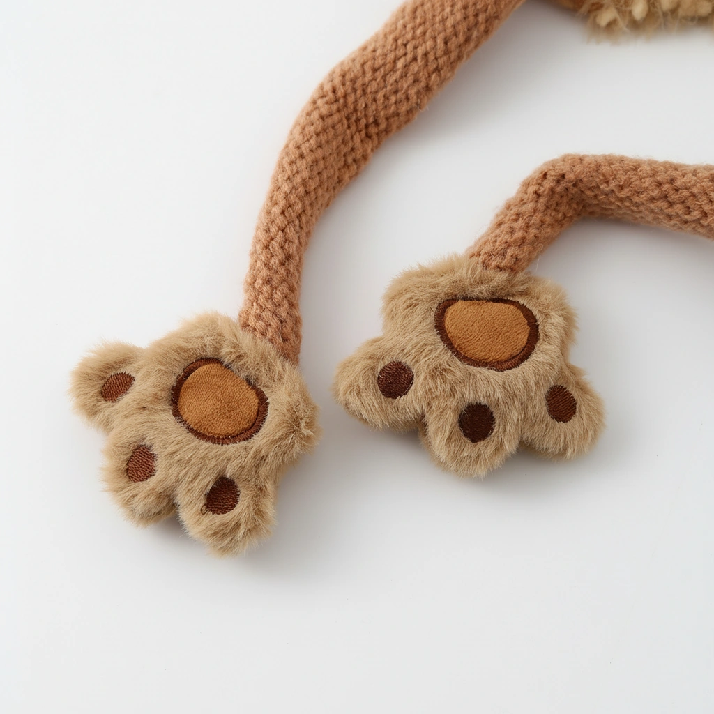 • Playful Paw Straps: The long braided knit straps end in fuzzy paws, perfect for tying securely under the chin on windy days or letting them hang loose for style.