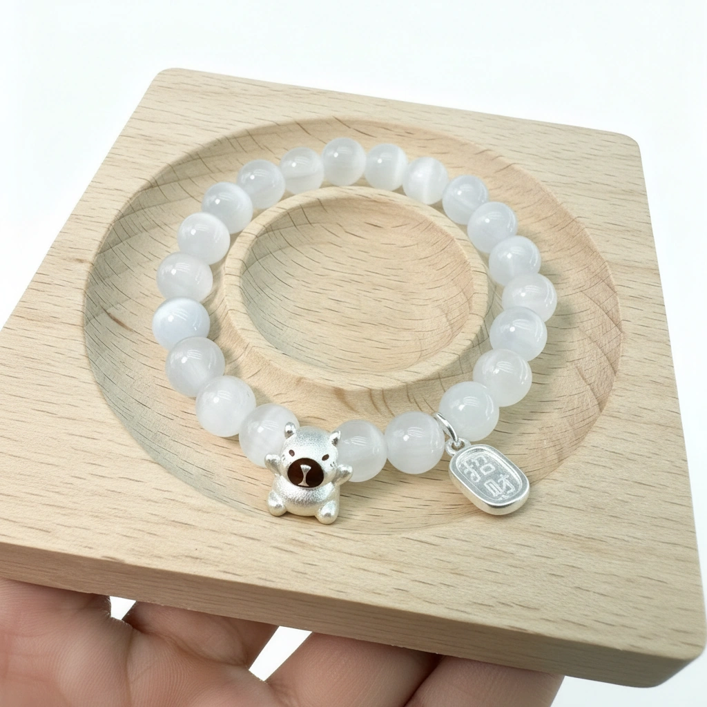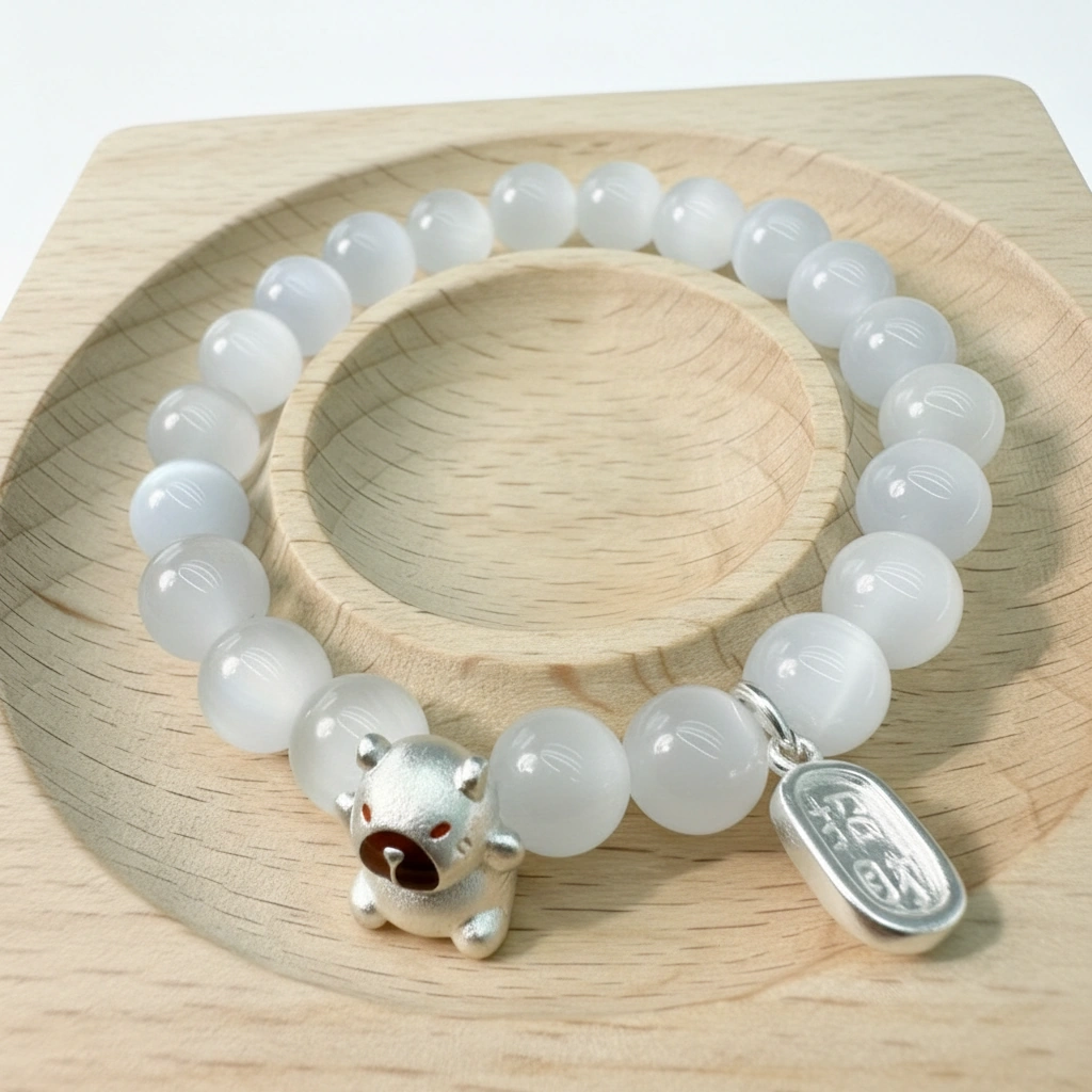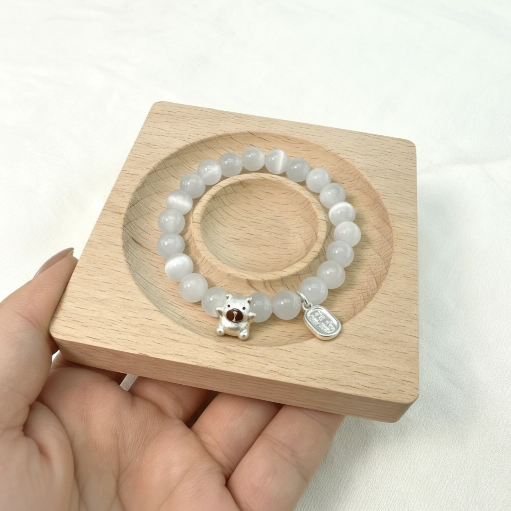 Luminous Cat’s Eye Stone (Elastic) For those who love a bit of sparkle, the beaded version features milky white Cat’s Eye stones. These beads possess a unique optical effect that shimmers when the light hits them, resembling moonlight. This style includes a small silver tag engraved with “Zhao Cai” (Attracting Wealth), making it a thoughtful token for prosperity and good luck. The silver capybara charm sits centrally, featuring a cute brown accent on its nose.