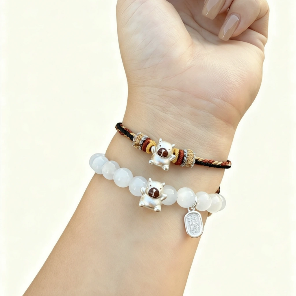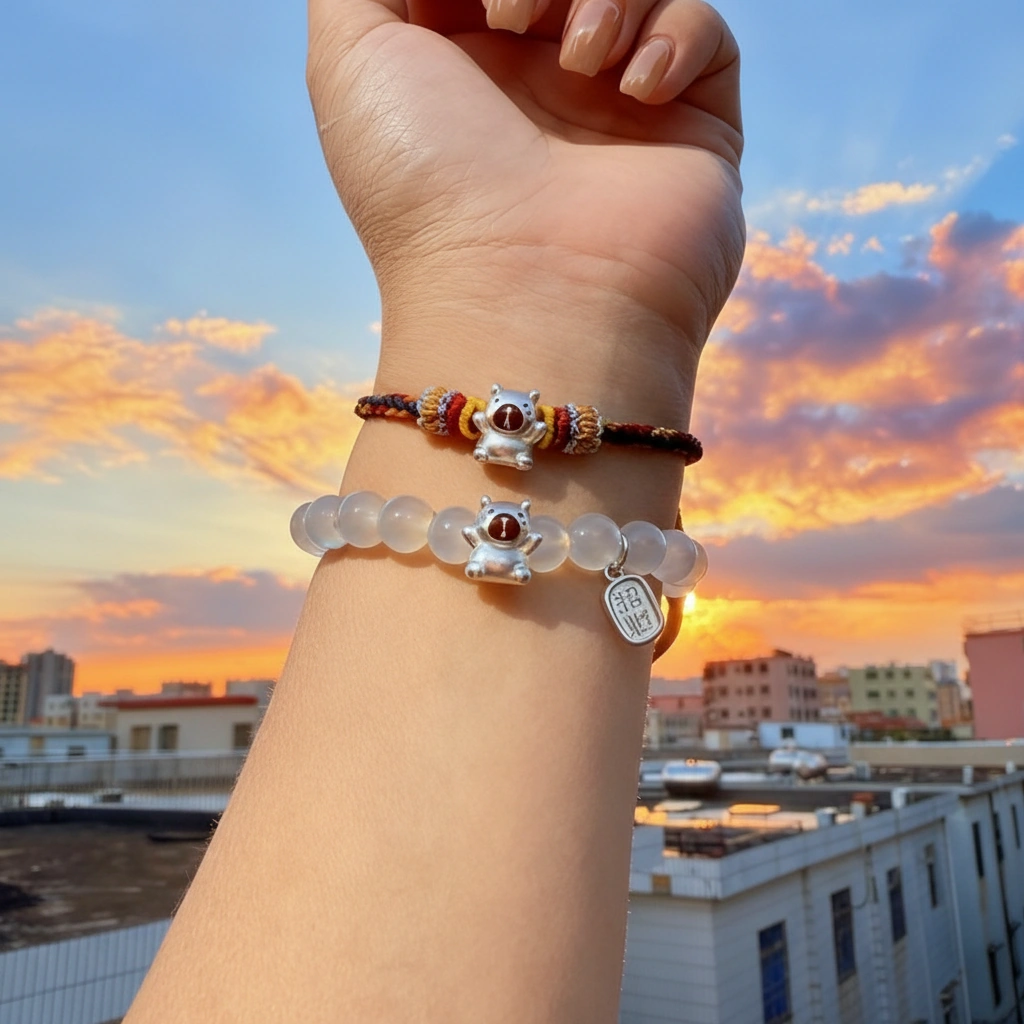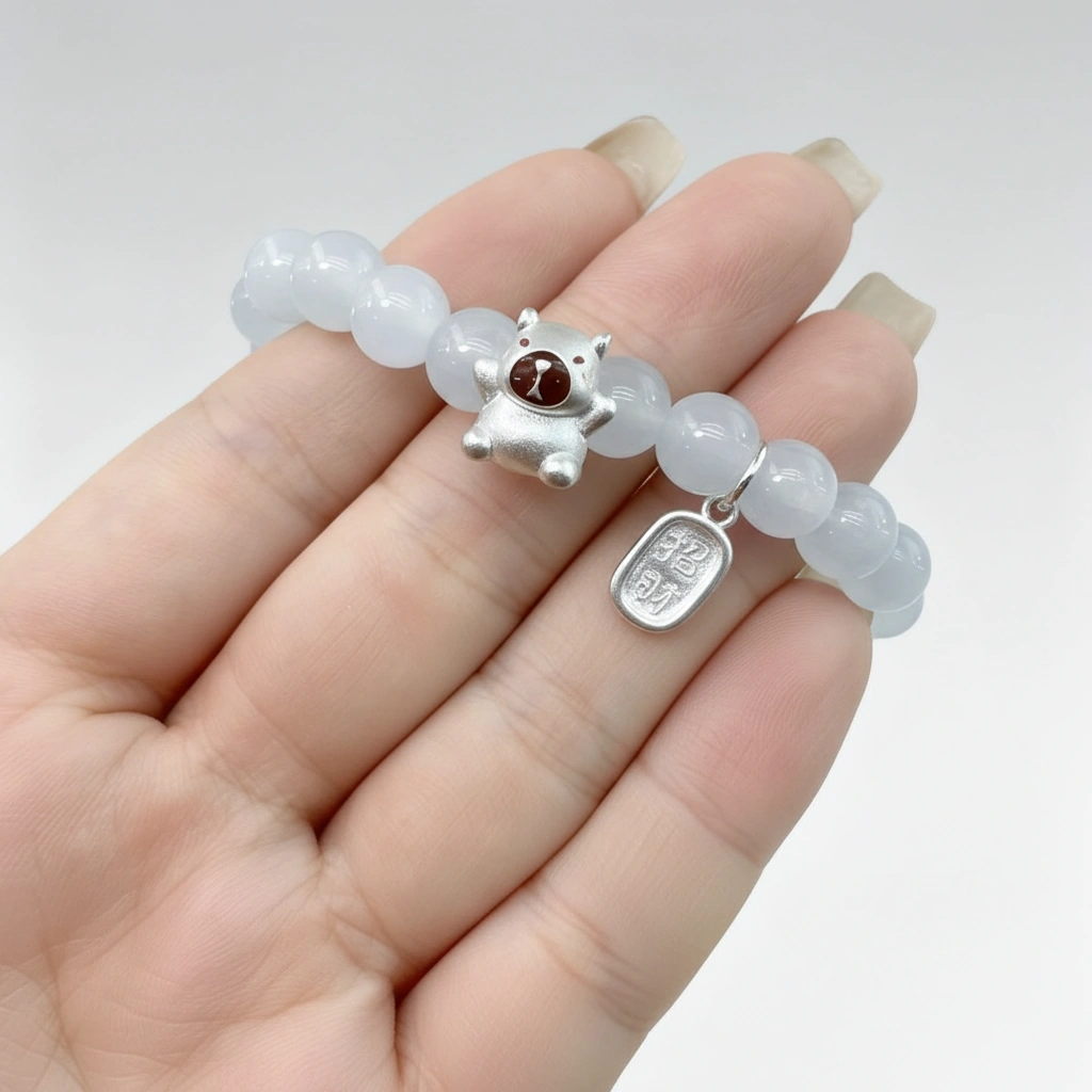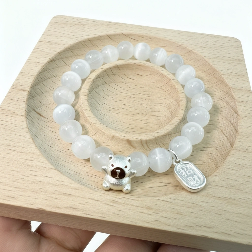 Luminous Cat’s Eye Stone (Elastic) For those who love a bit of sparkle, the beaded version features milky white Cat’s Eye stones. These beads possess a unique optical effect that shimmers when the light hits them, resembling moonlight. This style includes a small silver tag engraved with “Zhao Cai” (Attracting Wealth), making it a thoughtful token for prosperity and good luck. The silver capybara charm sits centrally, featuring a cute brown accent on its nose.