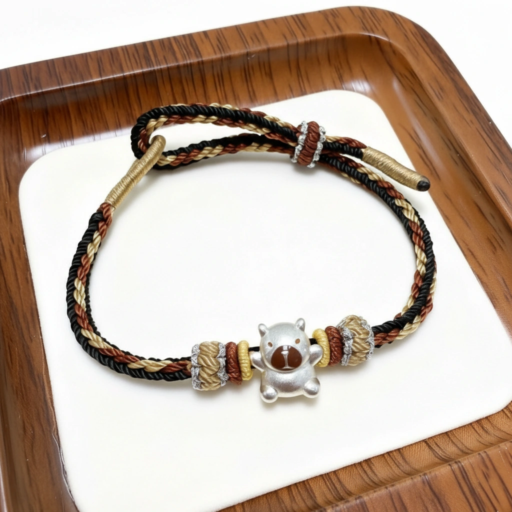 999 Fine Silver Capybara Charm Bracelet – Cat’s Eye Stone & Braided Rope Styles