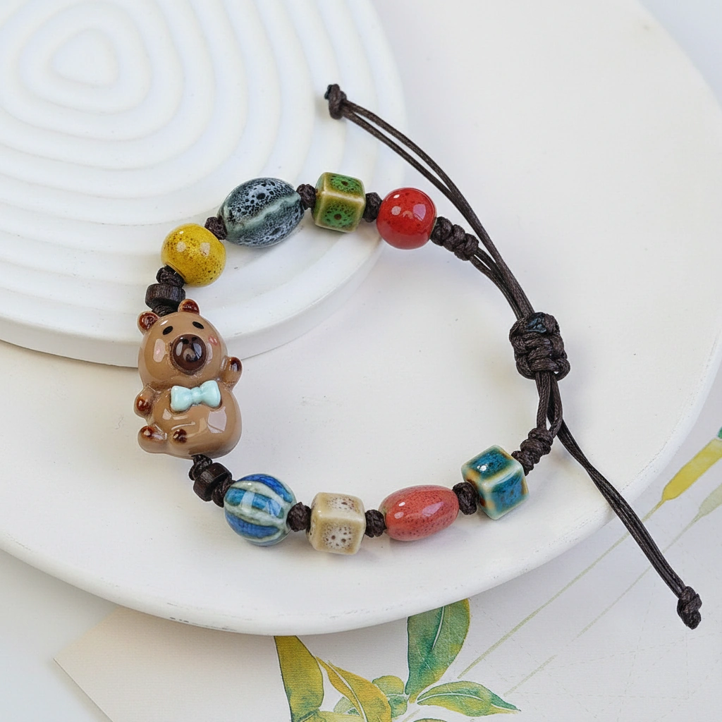 Artisan Ceramic Charm At the center of the bracelet sits a carefully crafted ceramic bead. The fired clay provides a smooth, glossy finish that highlights the adorable features of the capybara. Unlike plastic alternatives, the ceramic material offers a satisfying weight and a premium feel.