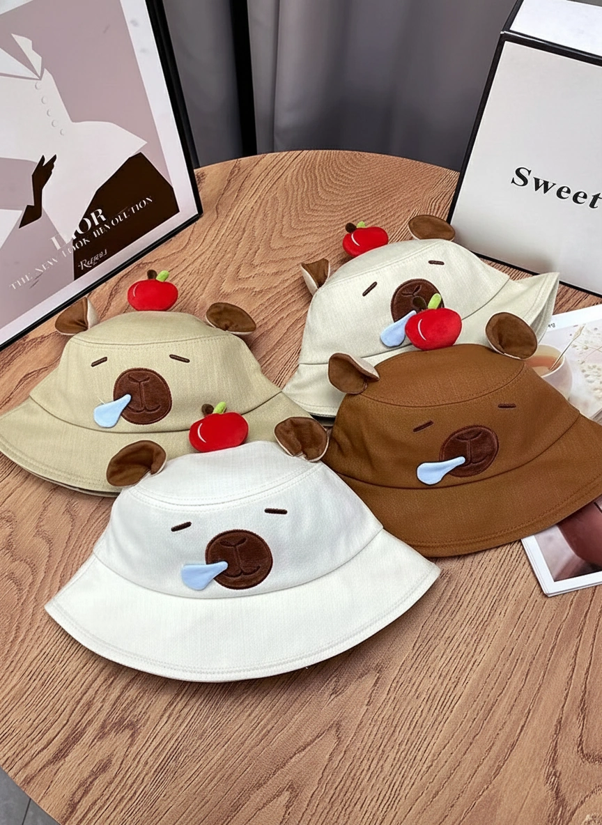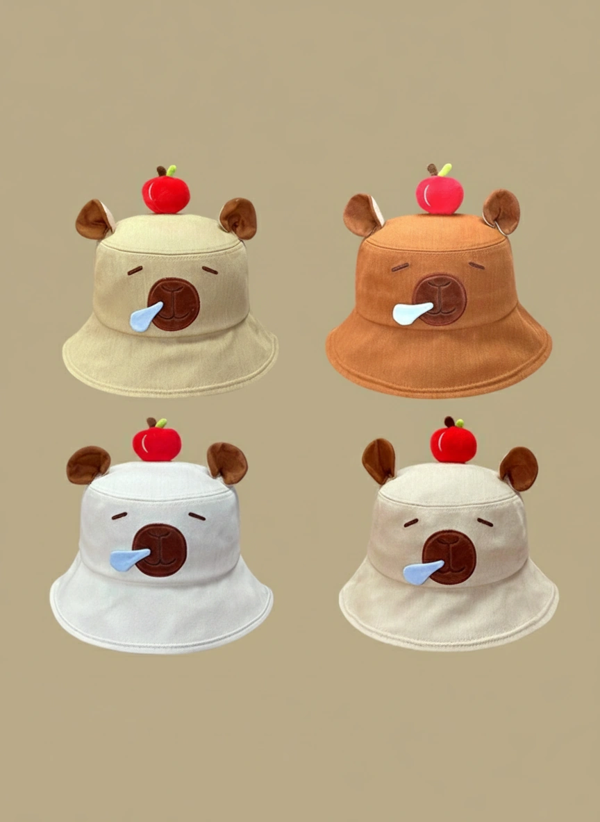 Adult Canvas Capybara Bucket Hat – Sleepy Face with 3D Red Apple (4 Colors)