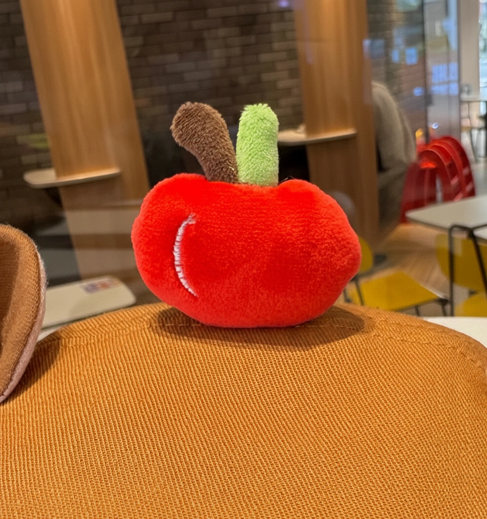 • Top: A plush 3D Red Apple (or fruit) perched securely on the crown, complete with a cute green stem.