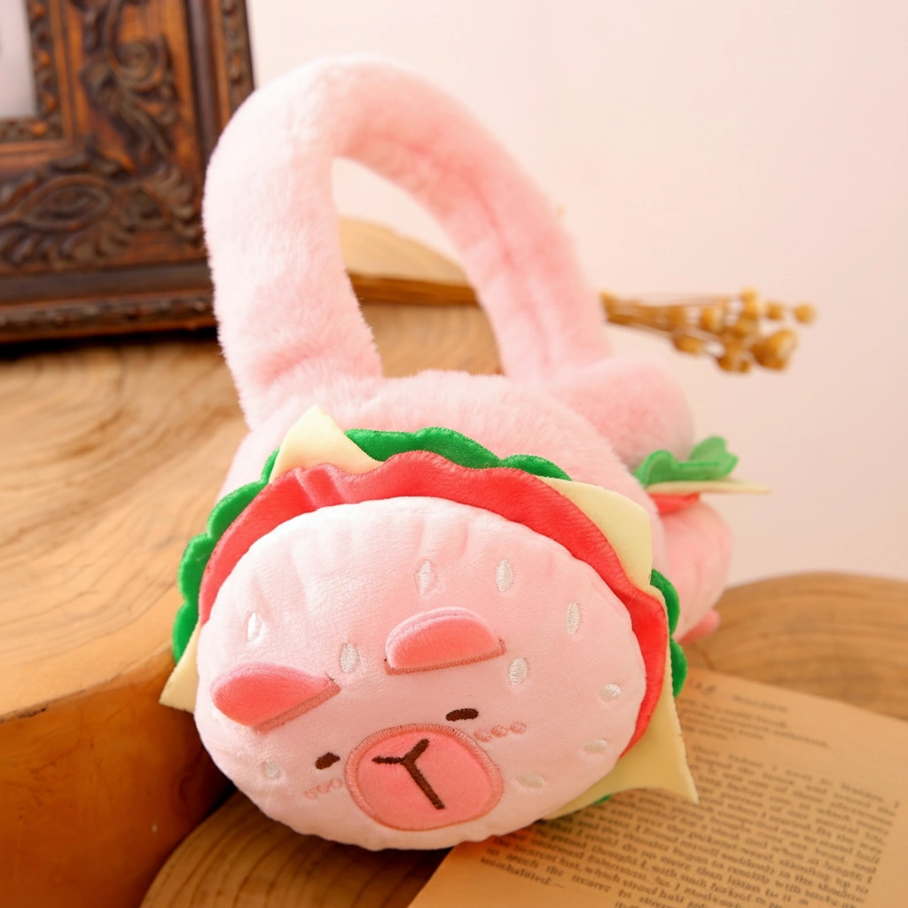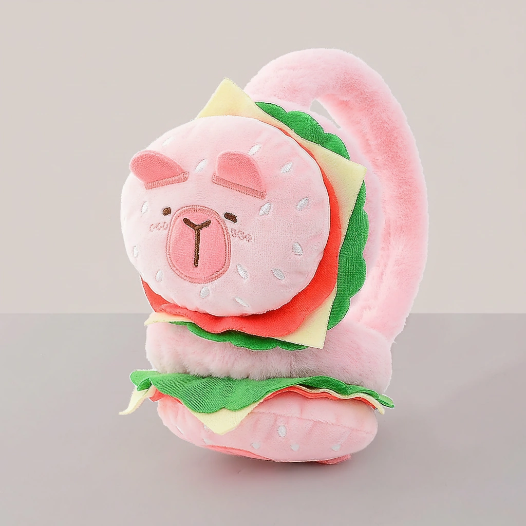 Funny Capybara Hamburger Earmuffs – 3D Plush Burger Ear Warmers (Brown & Pink) – Novelty Gift