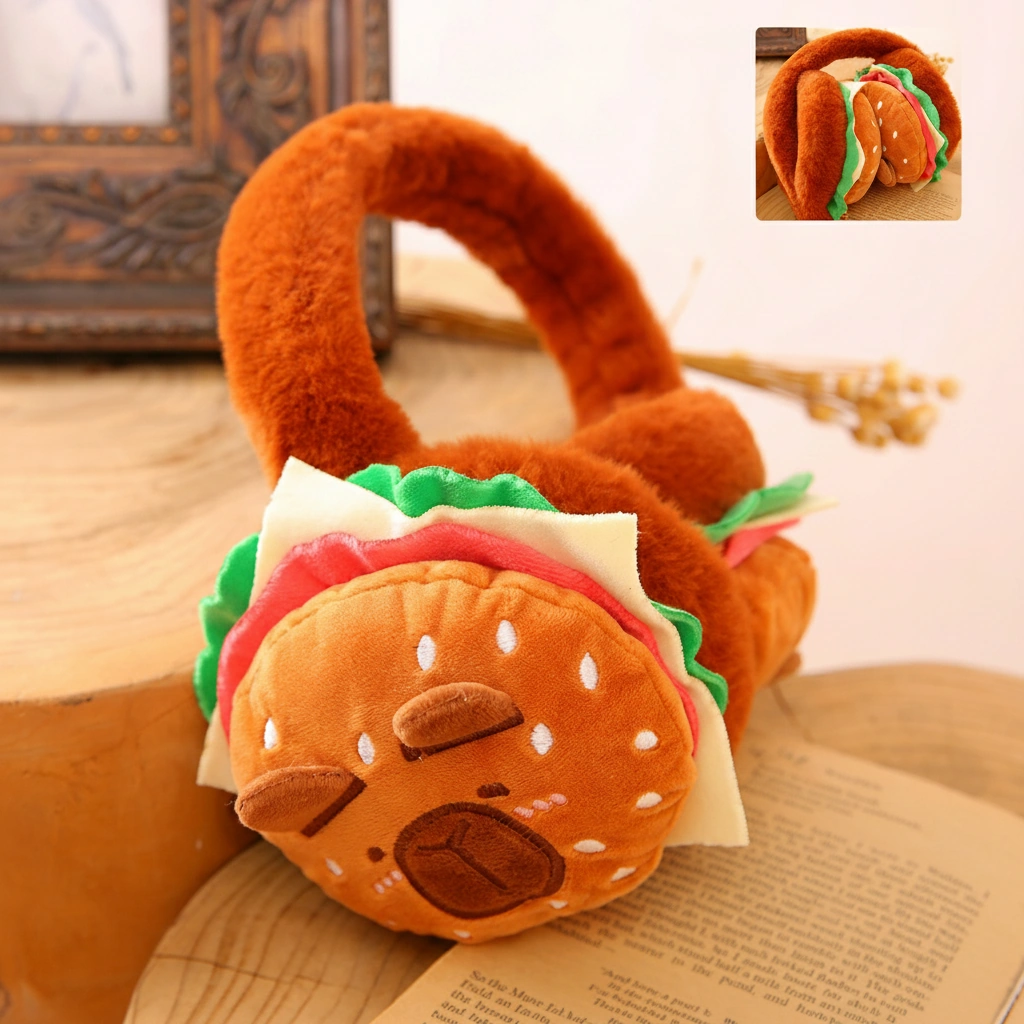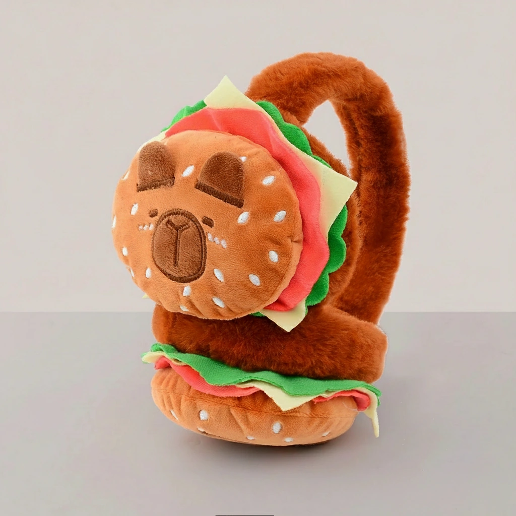 • Hilarious 3D Layered Design: These aren’t just printed fabric. Each earmuff is constructed with actual plush layers representing a sesame seed bun (the capybara face), ruffled green lettuce, a slice of red tomato, and melting yellow cheese. It is a full 3D burger stack on your ears!