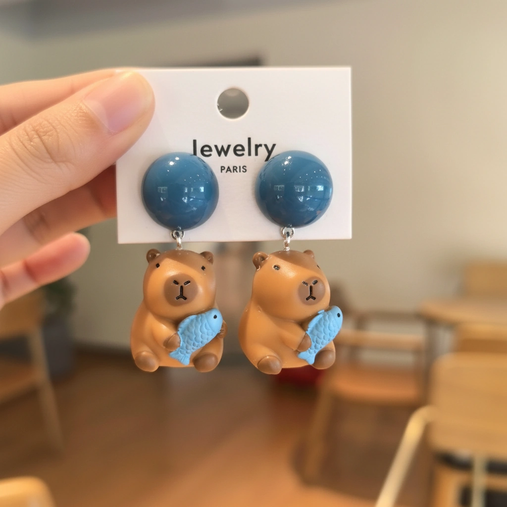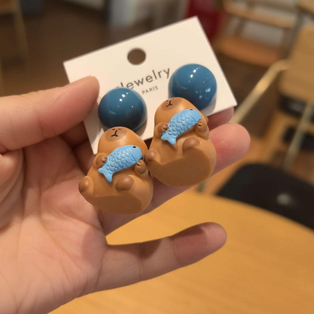 The Ultimate Friendship: A Capybara and Its Lucky Fish! Nothing says “unconditional friendship” like a capybara giving a big squeeze to its favorite fish friend. These capybara stud earrings are designed for those who love the heartwarming and quirky side of nature. With a vibrant orange fish held tightly in its paws, this capybara isn’t just an accessory—it’s a tiny reminder to hold onto the things (and people!) that make you happy.