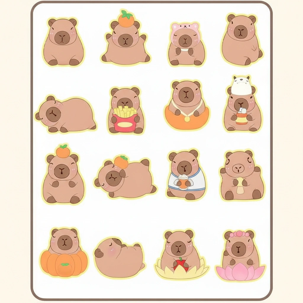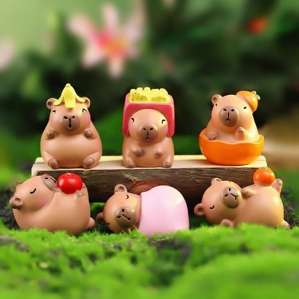 - Fruit & Nature Accents: Several capybaras feature delightful additions like oranges, apples, or green sprouts resting on their heads.