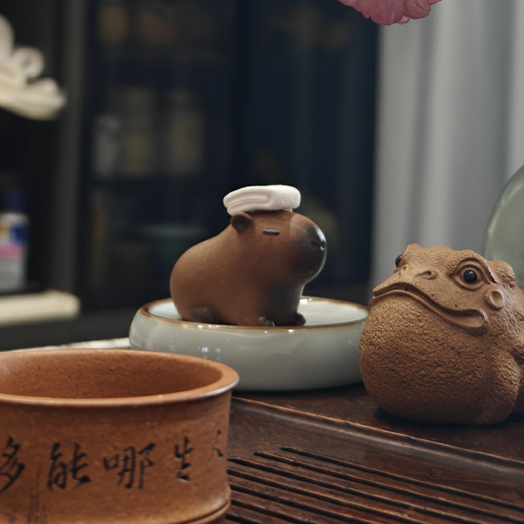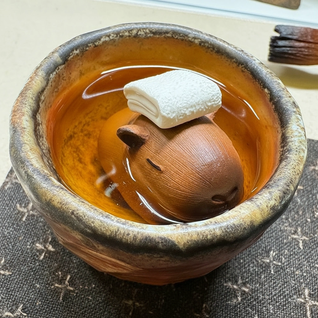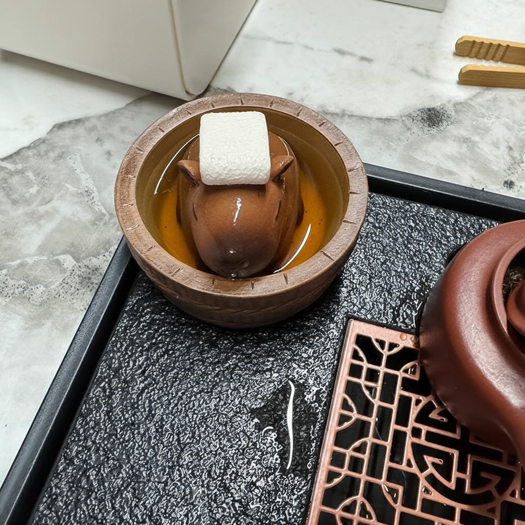 Hot Spring Capybara Tea Pet – Handmade Resin Tea Pet with White Towel Accessory