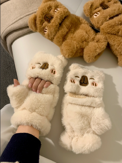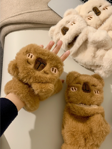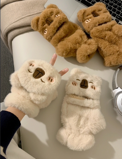 Adult Thick Plush Capybara Gloves – Convertible Fingerless Mittens with Blushing Face (2 Colors)