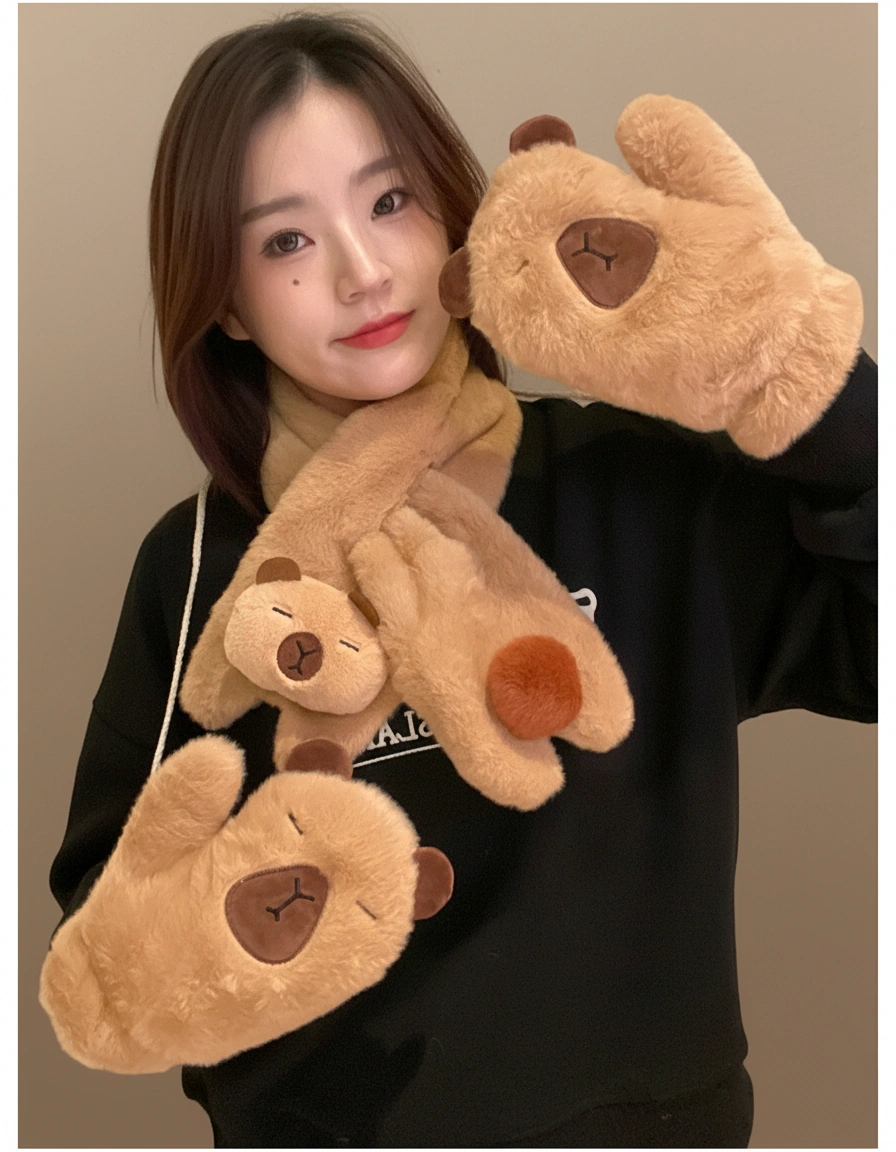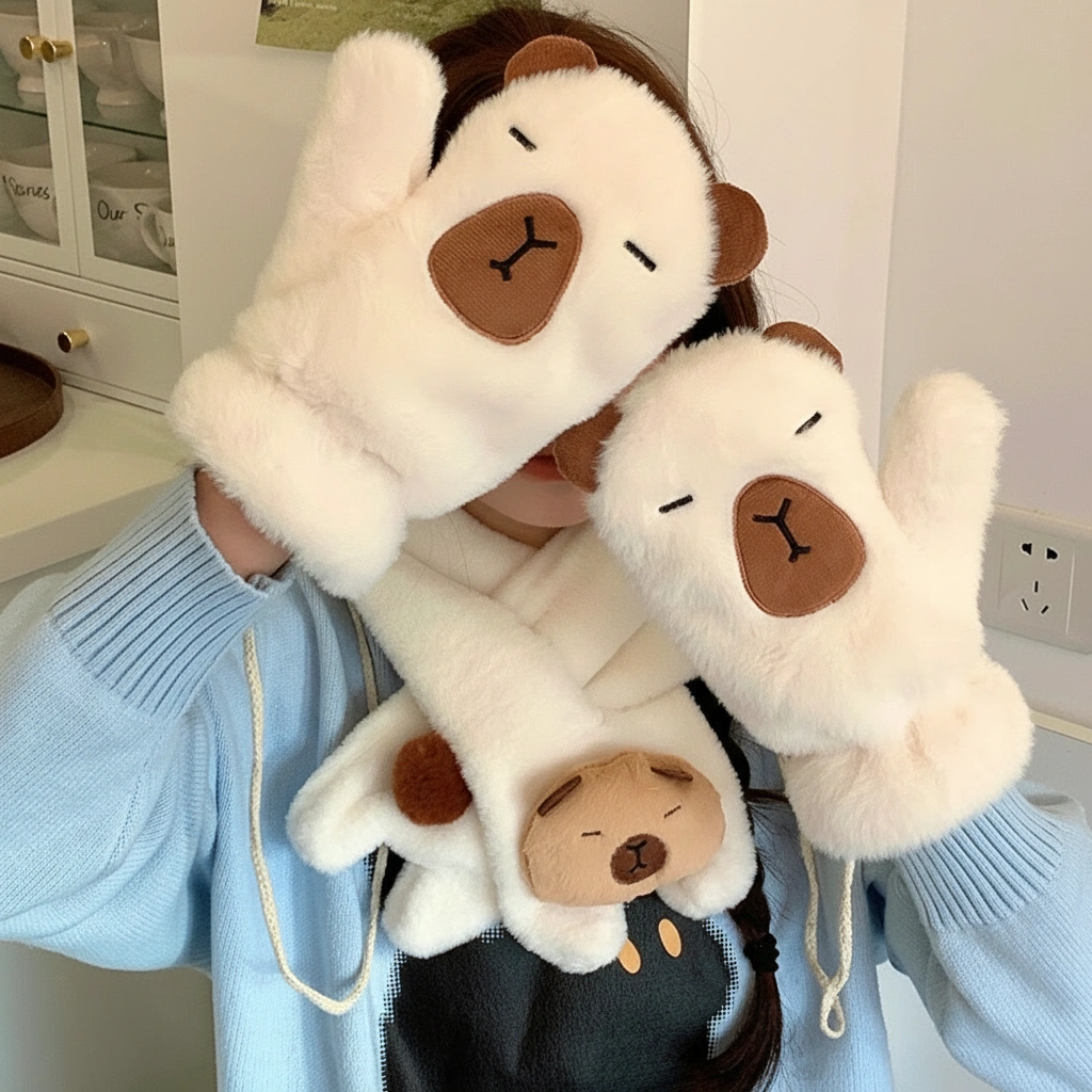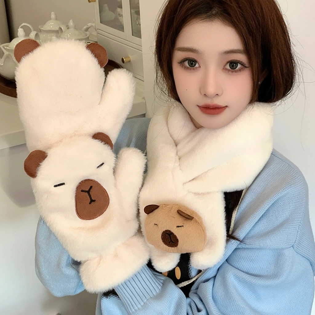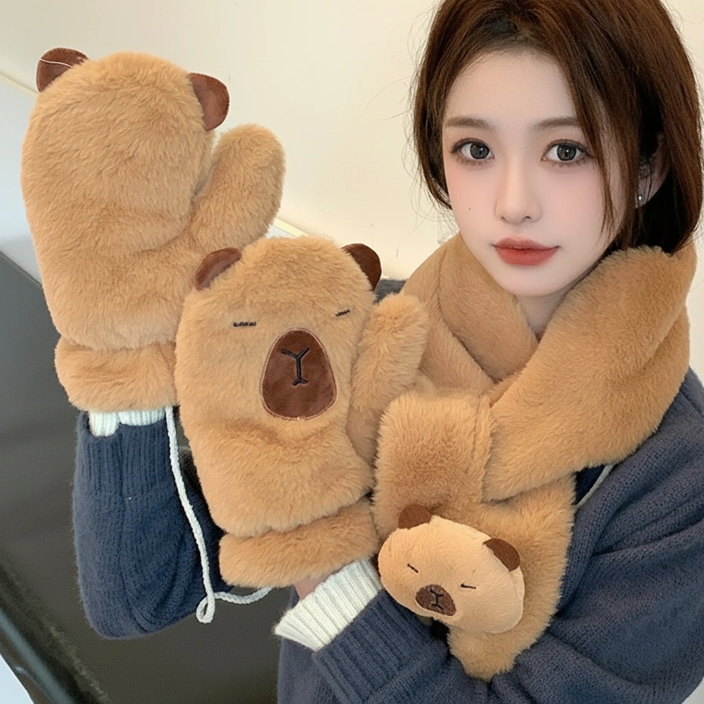 Capybara Fuzzy Scarf and Mitten Bundle – Plush Winter Neck Warmer & Gloves Set (2 Colors)