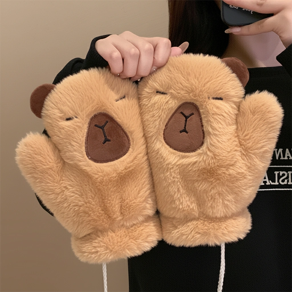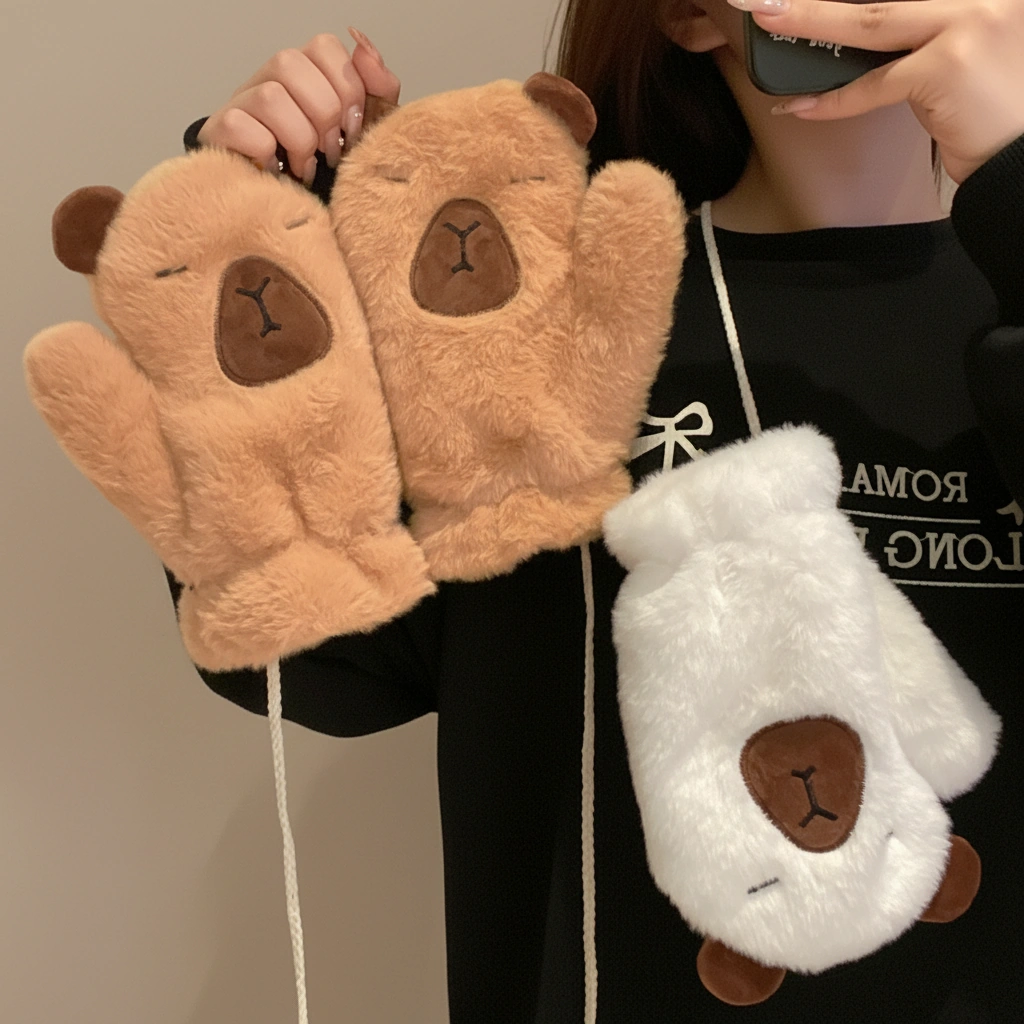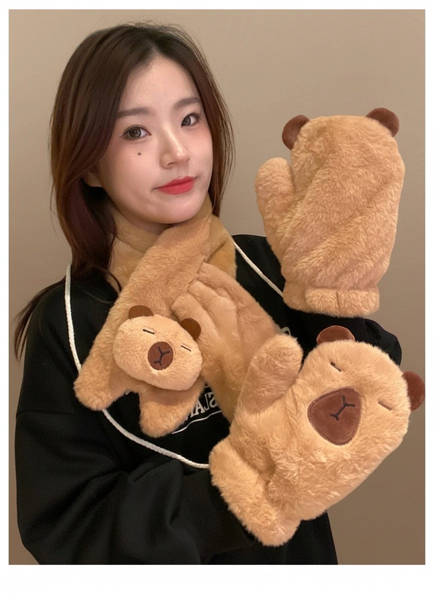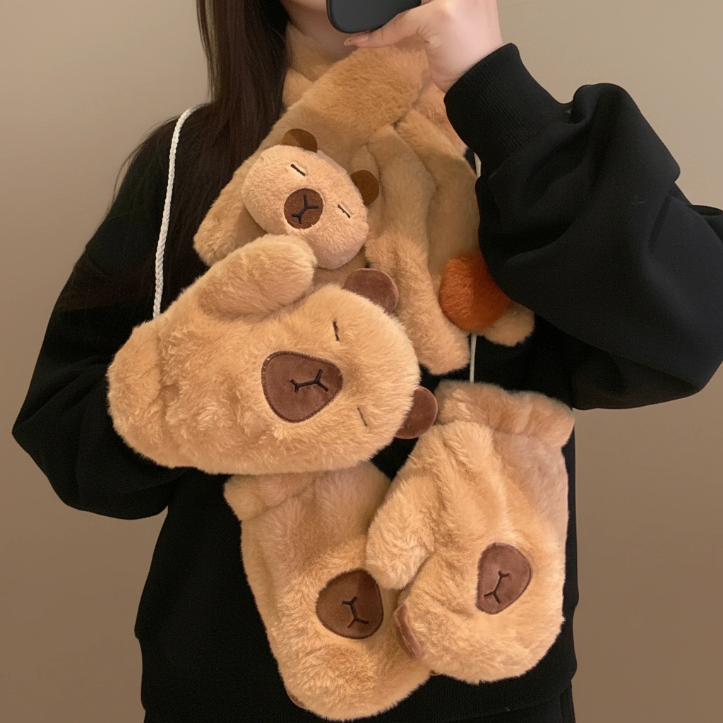 Capybara Fuzzy Scarf and Mitten Bundle – Plush Winter Neck Warmer & Gloves Set (2 Colors)