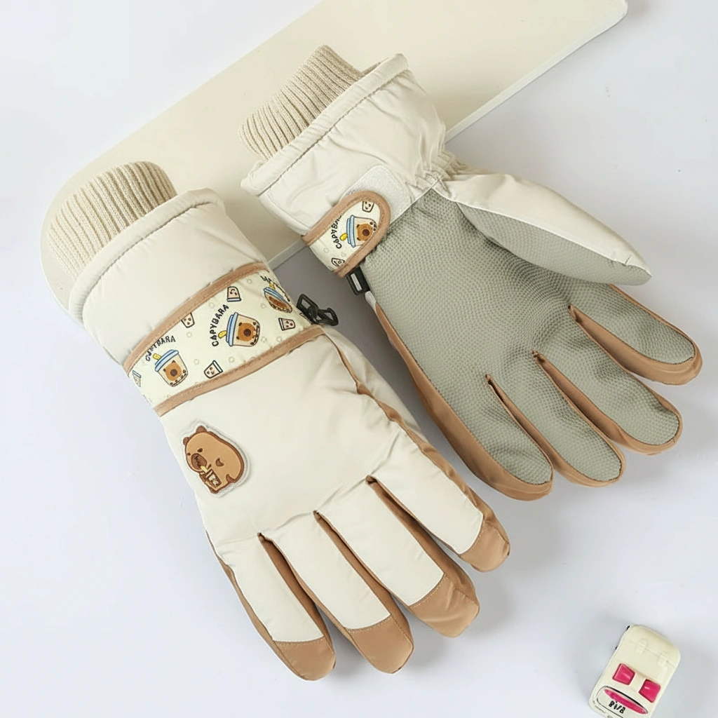 Exclusive “Capybara & Boba” Design Celebrate your love for comfort food and chill animals. Unlike standard athletic gear, these gloves feature a unique aesthetic touch: a decorative wrist strap printed with a “Bubble Tea” pattern and a silicone patch showcasing a capybara enjoying a drink. It is a delightful detail that adds personality to your winter outfit.