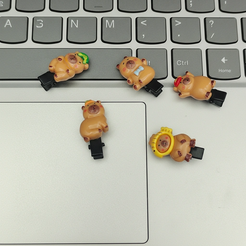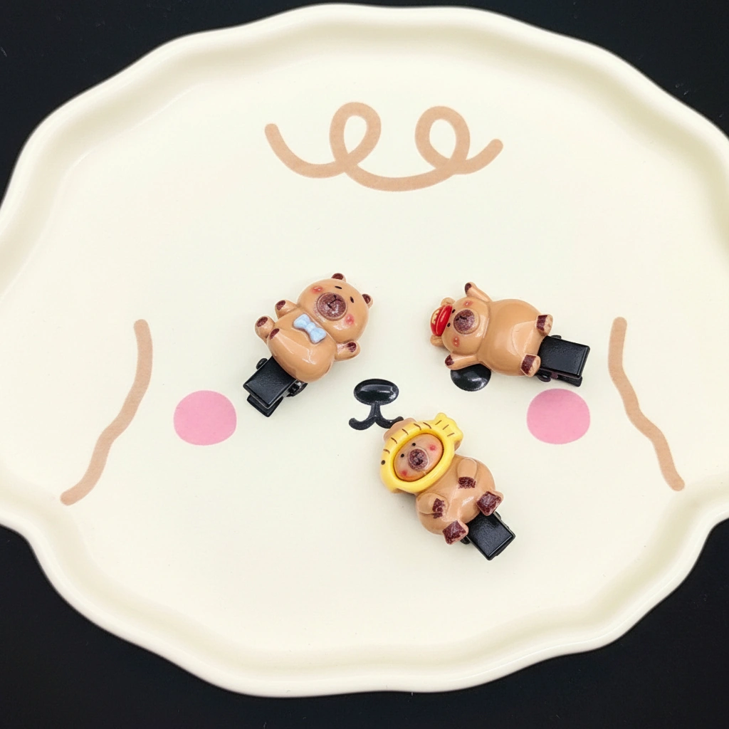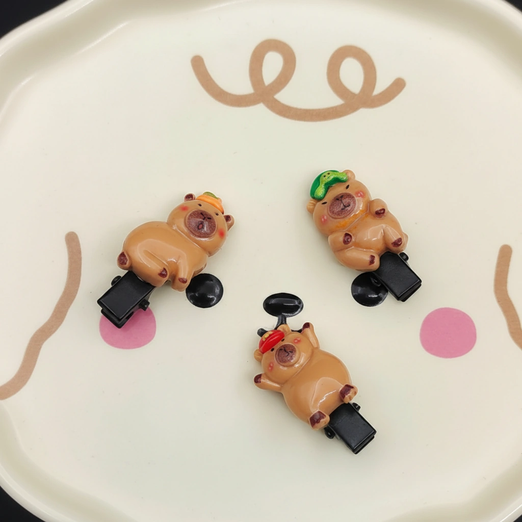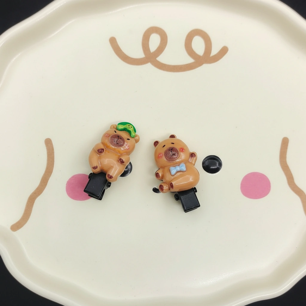 Add a delicate touch of whimsy to any hairstyle with this set of Miniature Capybara Clips. Designed specifically for holding back small amounts of hair, these clips are significantly smaller and lighter than standard barrettes. They feature a discreet black plastic base that disappears into the hair, letting the adorable 3D resin charm float visibly. These are an excellent choice for toddlers, children, or adults looking to pin back flyaways or decorate a braid.