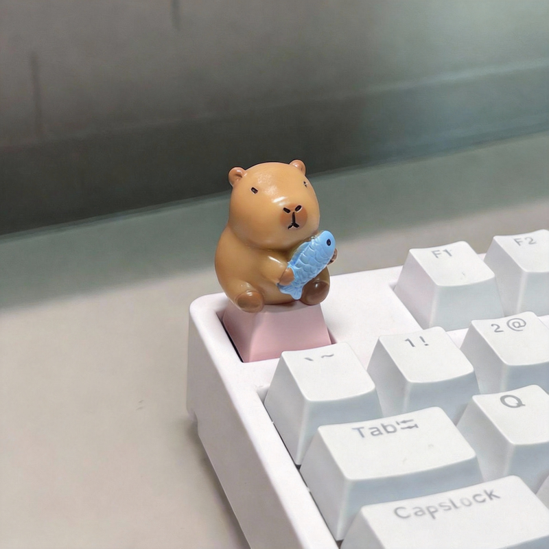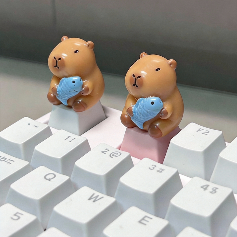 Cute Capybara Holding Blue Fish Keycap (1 Piece) – Pink or White Base