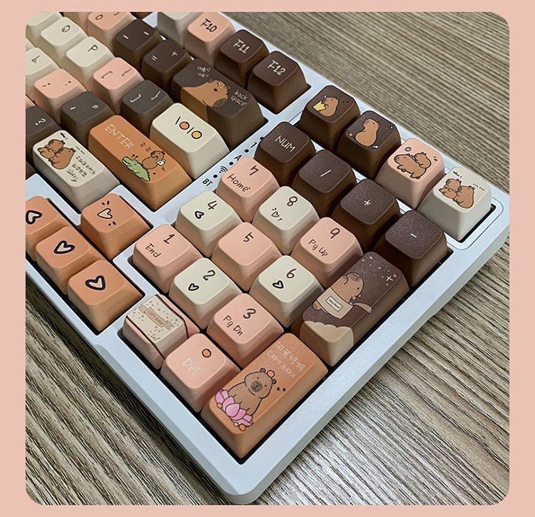 The custom novelty keys tell the story of a capybara’s slow life: balancing oranges, sitting in confusion with friends (“what? … …”), and just existing peacefully. It’s the perfect aesthetic for anyone who loves earth tones and cute animals.