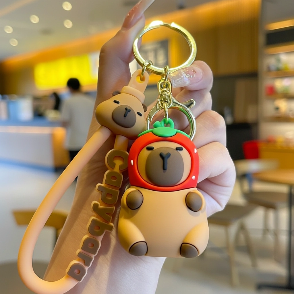 Cute Capybara Keychain – Strawberry Hood & Turtle Backpack Styles – Soft PVC & Gold Alloy Bag Charm