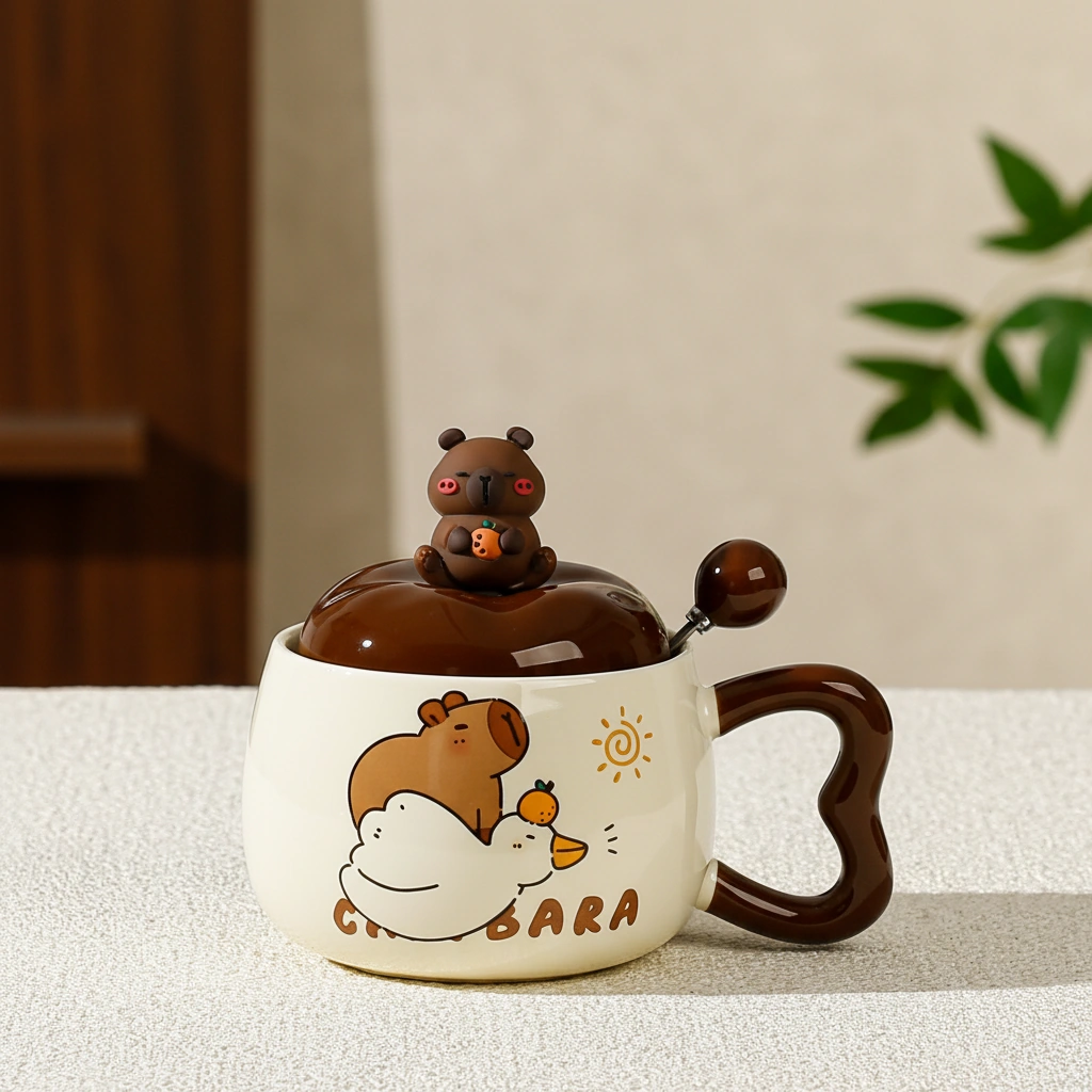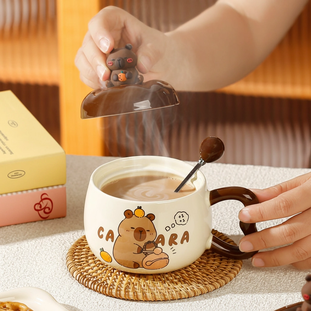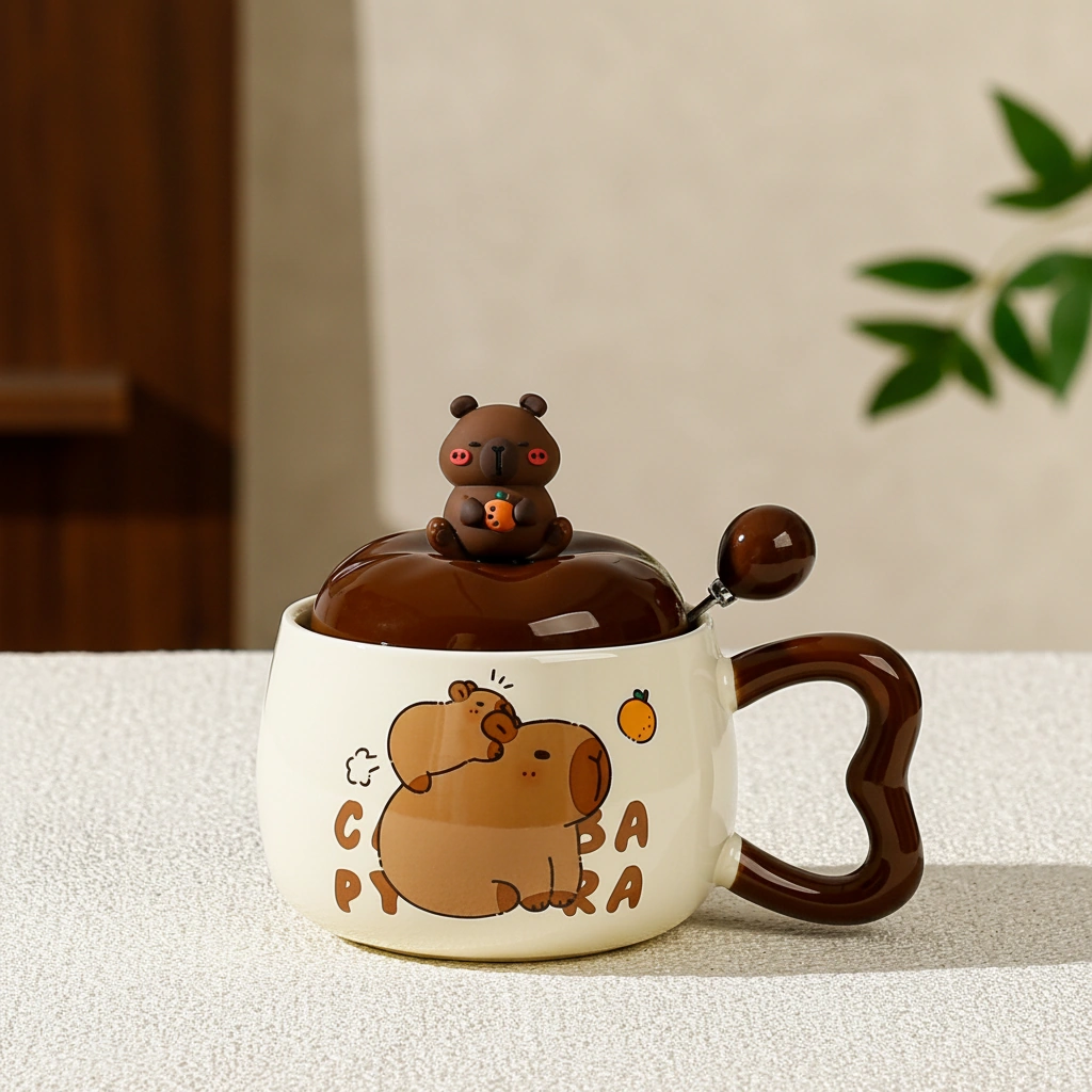 Every capybara mug in this collection is crafted from high-grade, heat-resistant ceramic with a smooth, glossy finish. The highlight is the custom 3D lid, topped with a miniature capybara figurine holding an orange, ensuring your drink stays warm while looking iconic. The set also includes a matching brown ceramic-tipped spoon, designed to fit perfectly through the lid’s notch for easy stirring.