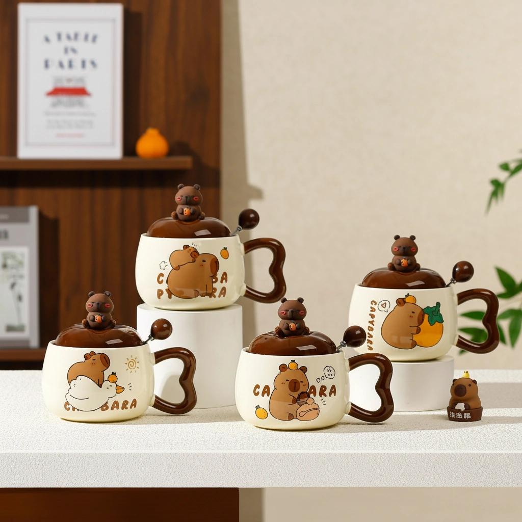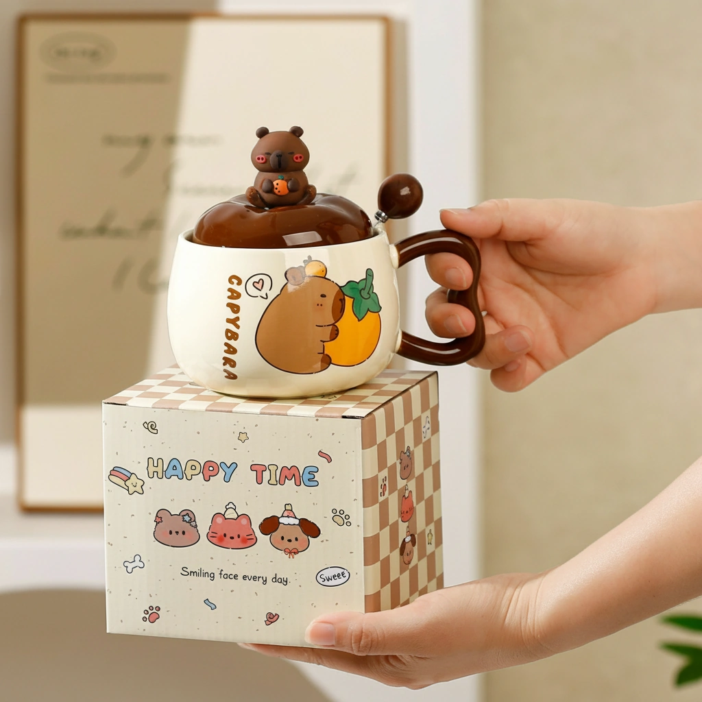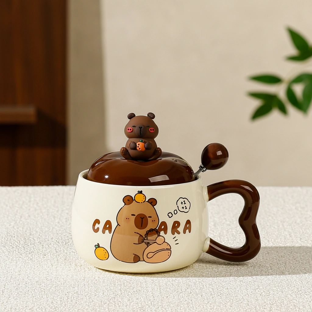 Every capybara mug in this collection is crafted from high-grade, heat-resistant ceramic with a smooth, glossy finish. The highlight is the custom 3D lid, topped with a miniature capybara figurine holding an orange, ensuring your drink stays warm while looking iconic. The set also includes a matching brown ceramic-tipped spoon, designed to fit perfectly through the lid’s notch for easy stirring.