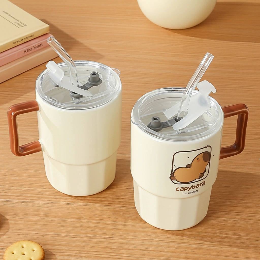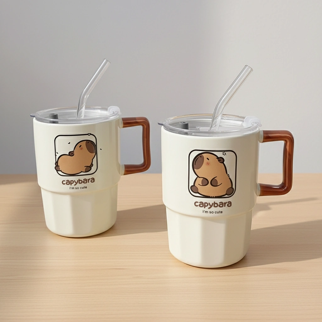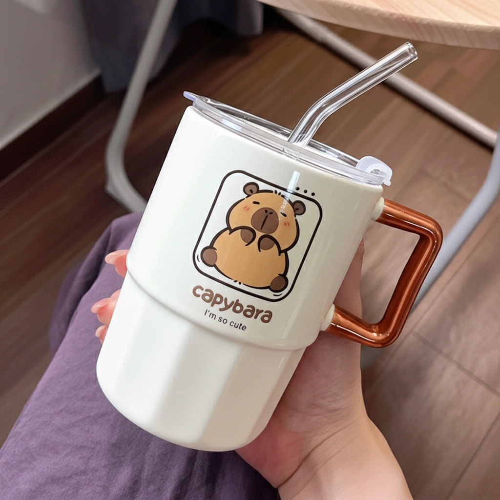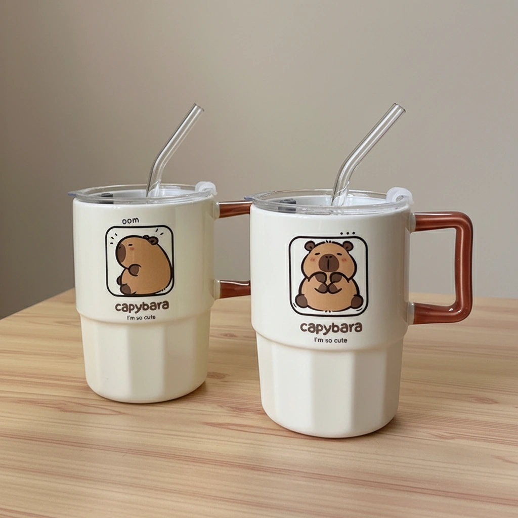 Capybara Sippy Cup – 14oz (420ml) Ceramic Tumbler with Glass Straw & Lid – 4 Styles