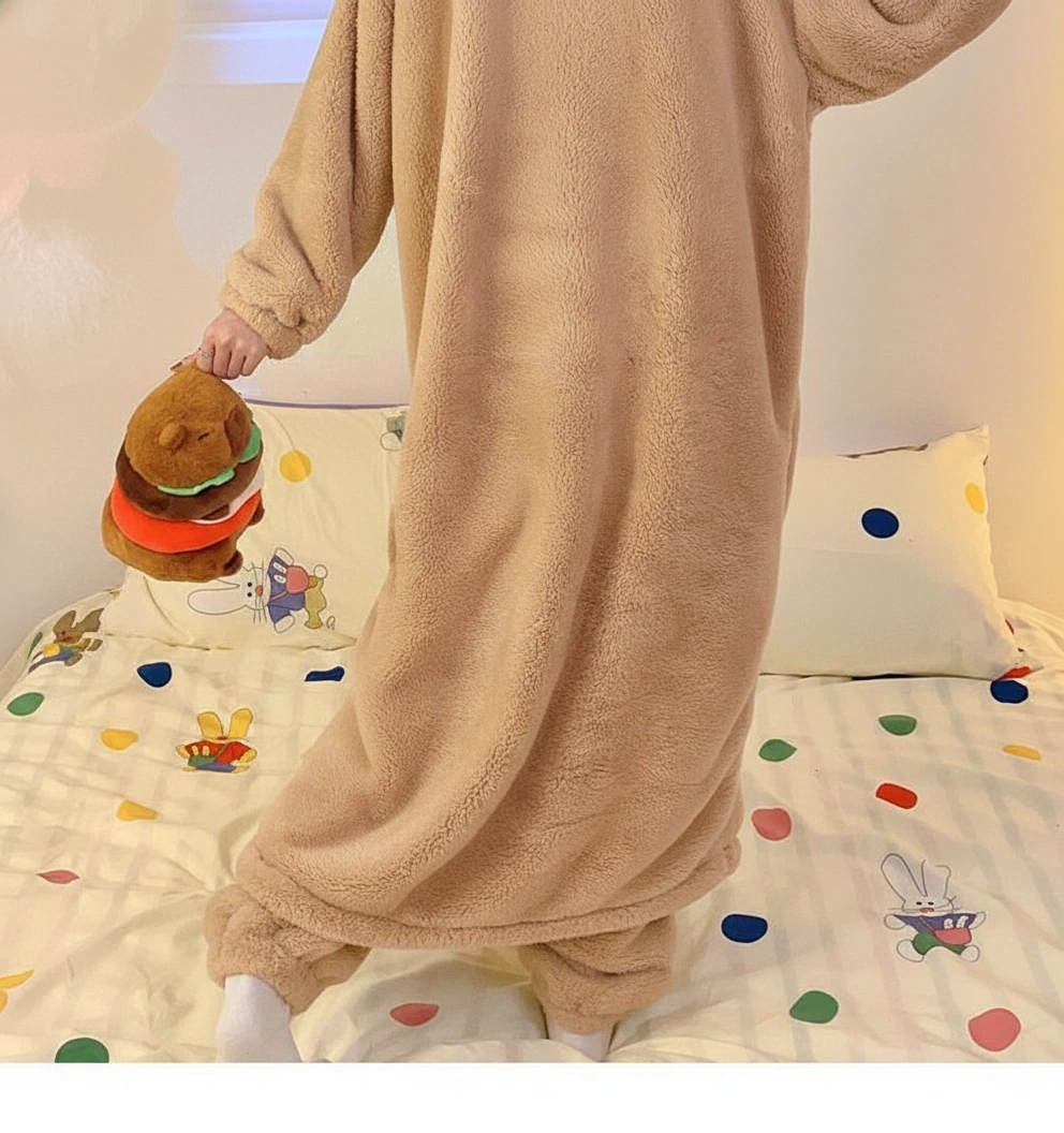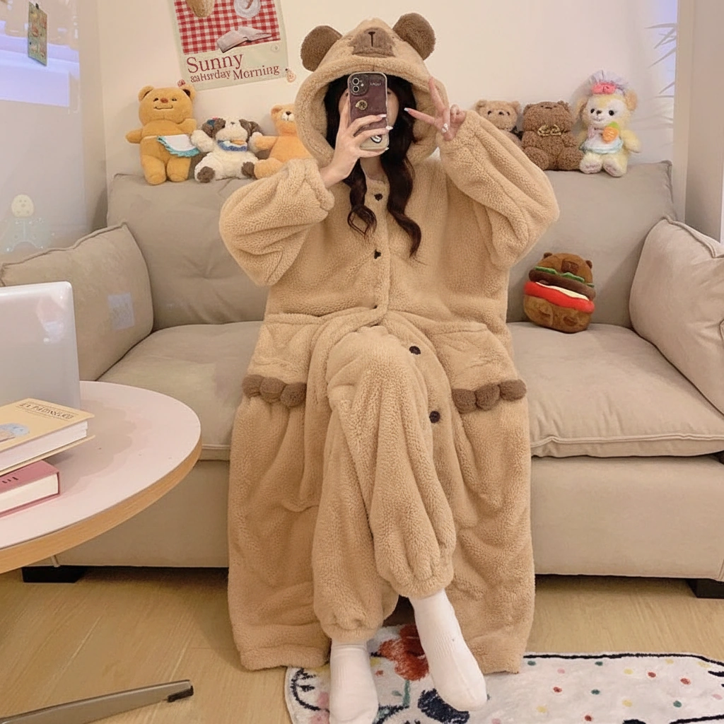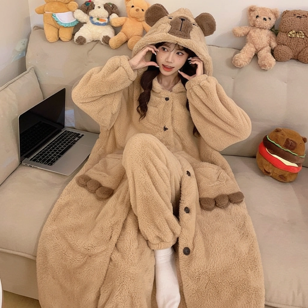 Why wear a normal pajama top when you can wear a hug? This capybara pajama set features an extra-long, coat-style cardigan that covers you from head to knees in thick, fluffy warmth. It’s the perfect hybrid between a bathrobe and a pajama set, designed for those who refuse to be cold.