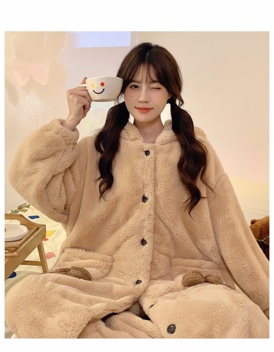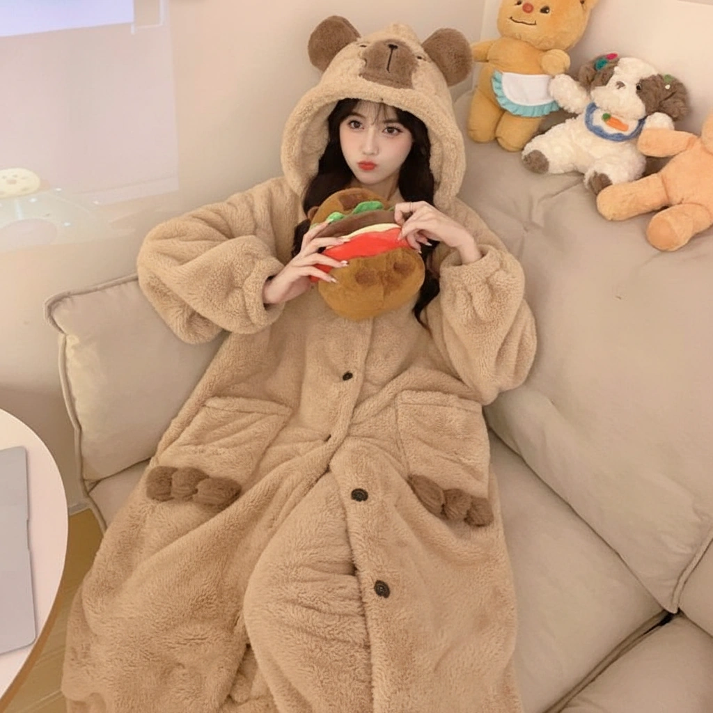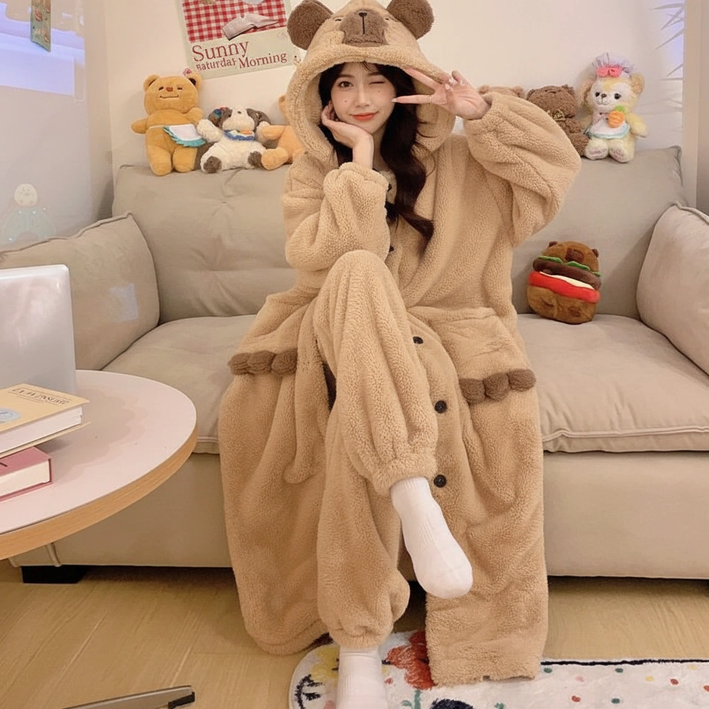 Why wear a normal pajama top when you can wear a hug? This capybara pajama set features an extra-long, coat-style cardigan that covers you from head to knees in thick, fluffy warmth. It’s the perfect hybrid between a bathrobe and a pajama set, designed for those who refuse to be cold.