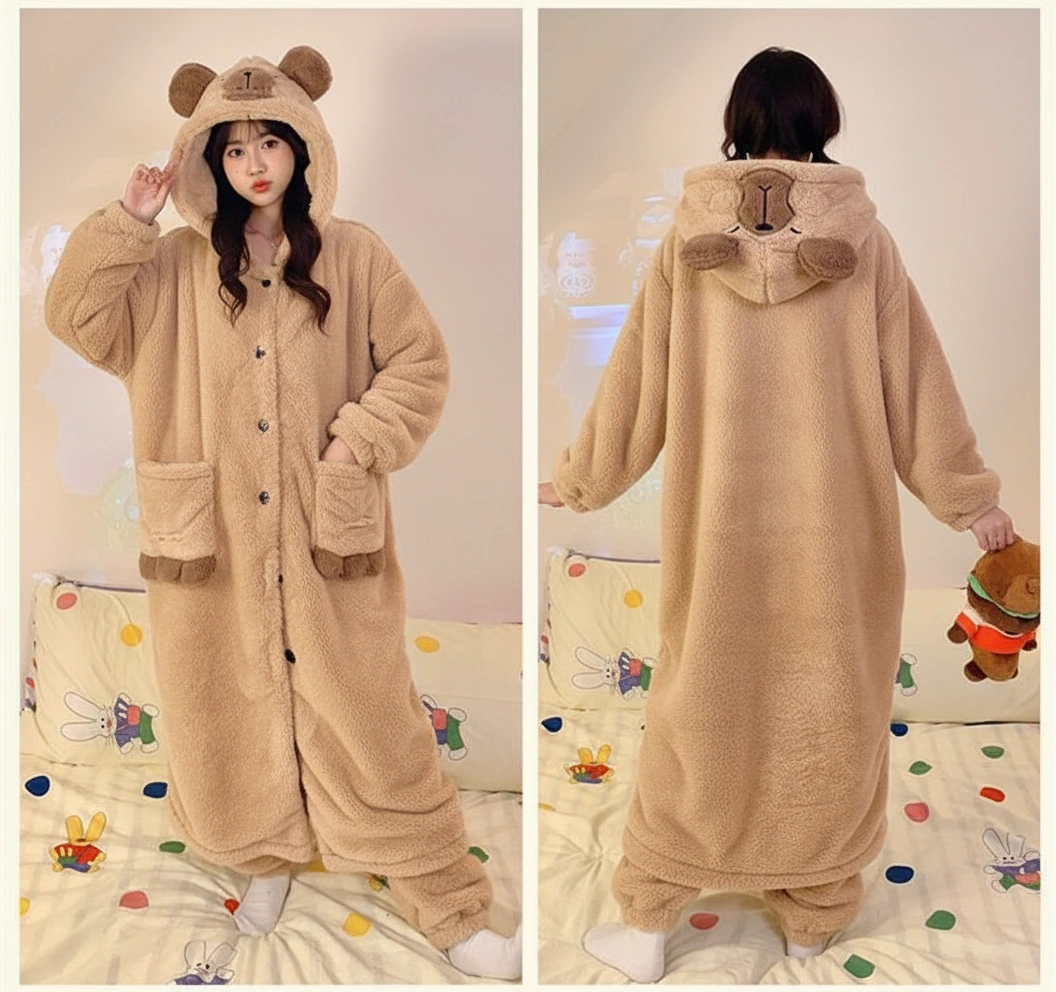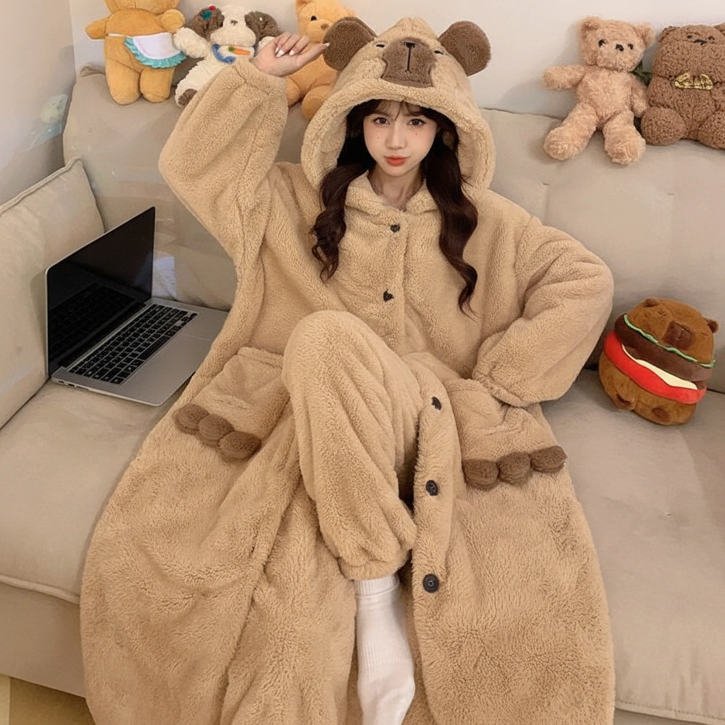 Capybara Pajamas Set – Long Sherpa Fleece Hooded Robe Coat & Pants (2-Piece)