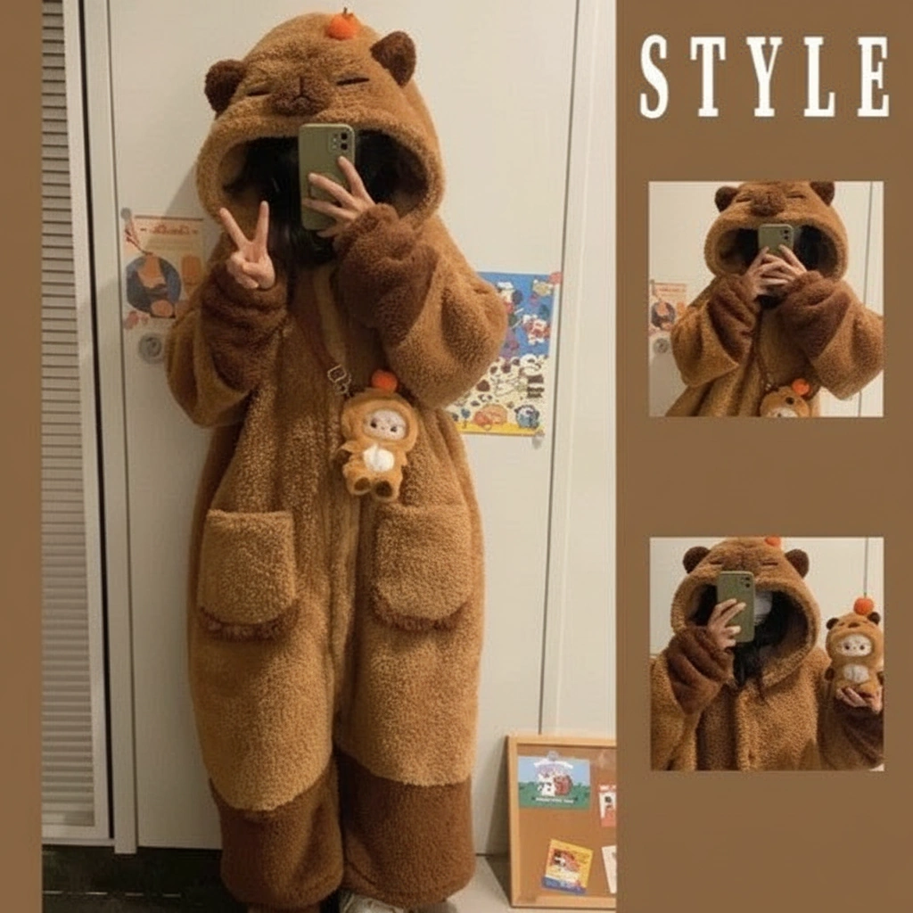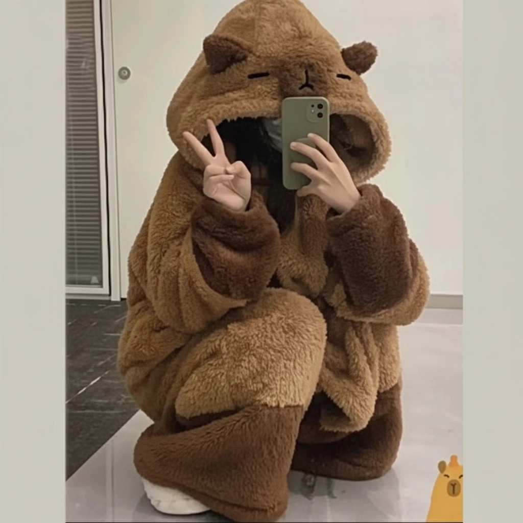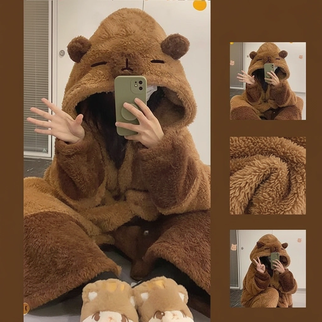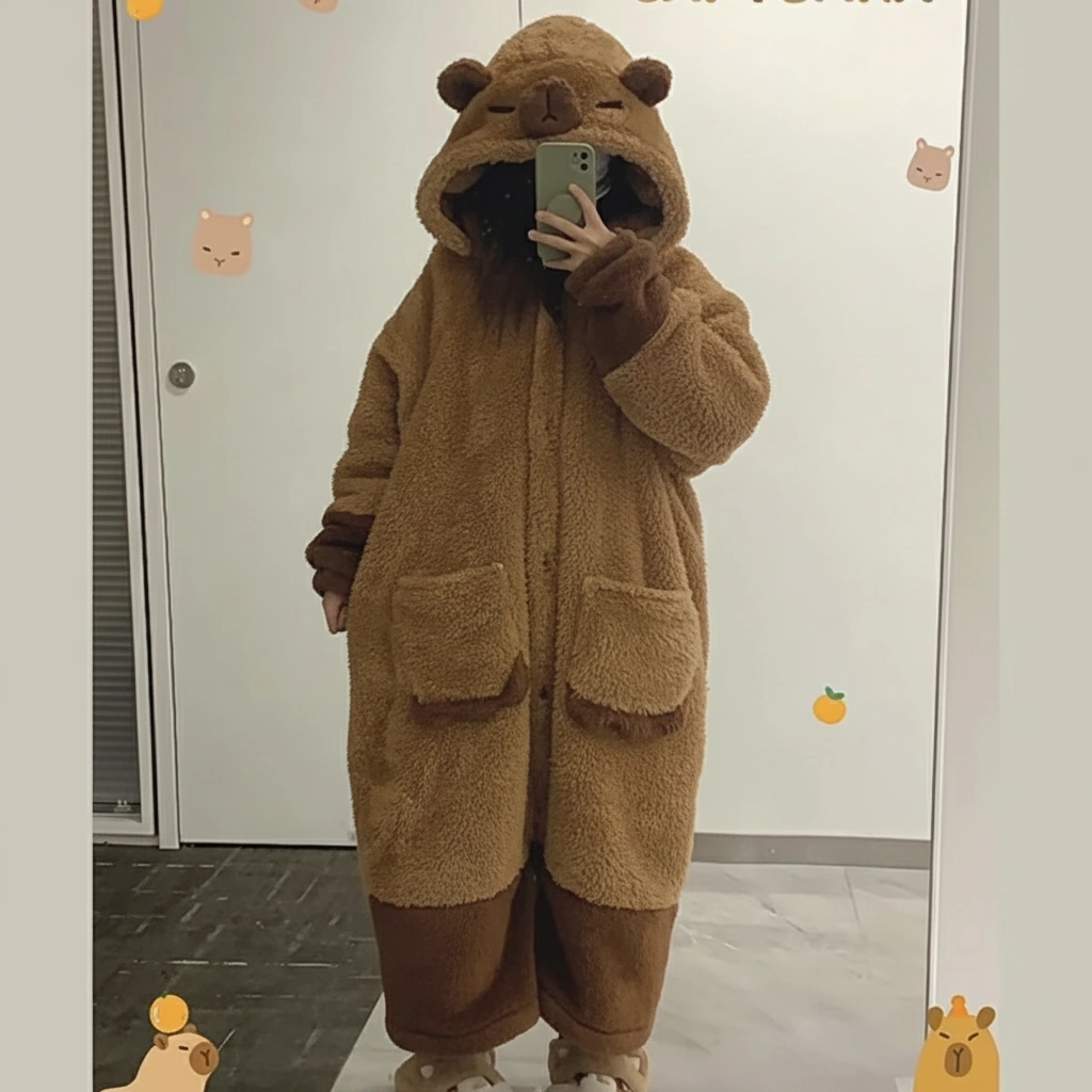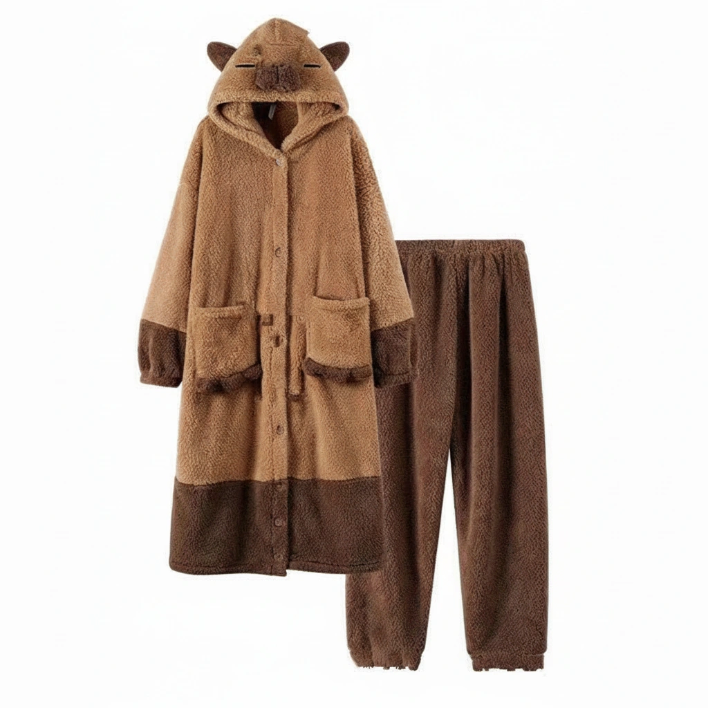When the temperature drops, it’s time to go into full “sleeping capybara” mode. This ultra-cozy long robe pajama set is designed to feel like a wearable blanket. Featuring a hood with a peaceful, sleeping capybara face, this set signals to the world (and your family) that you are off-duty and ready to relax.