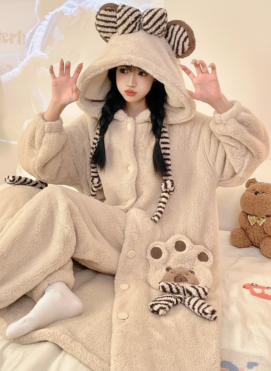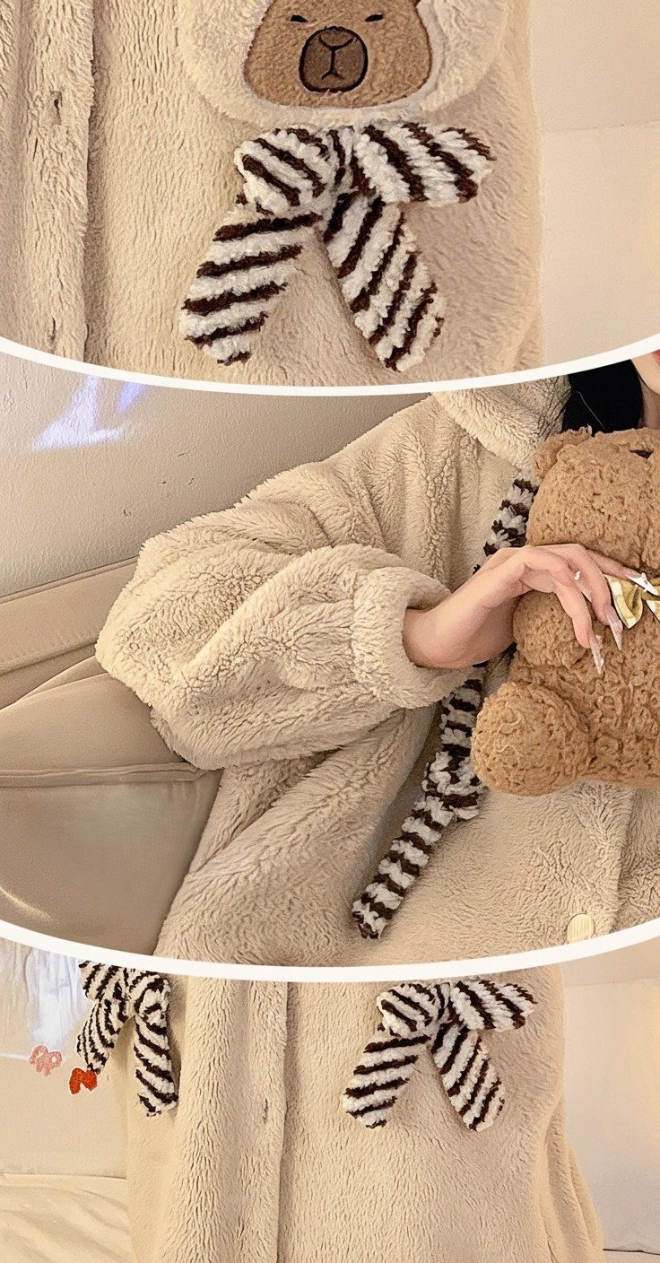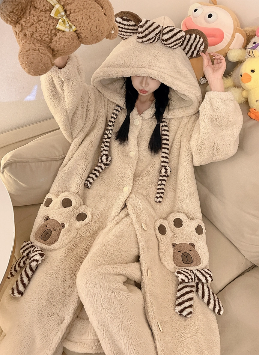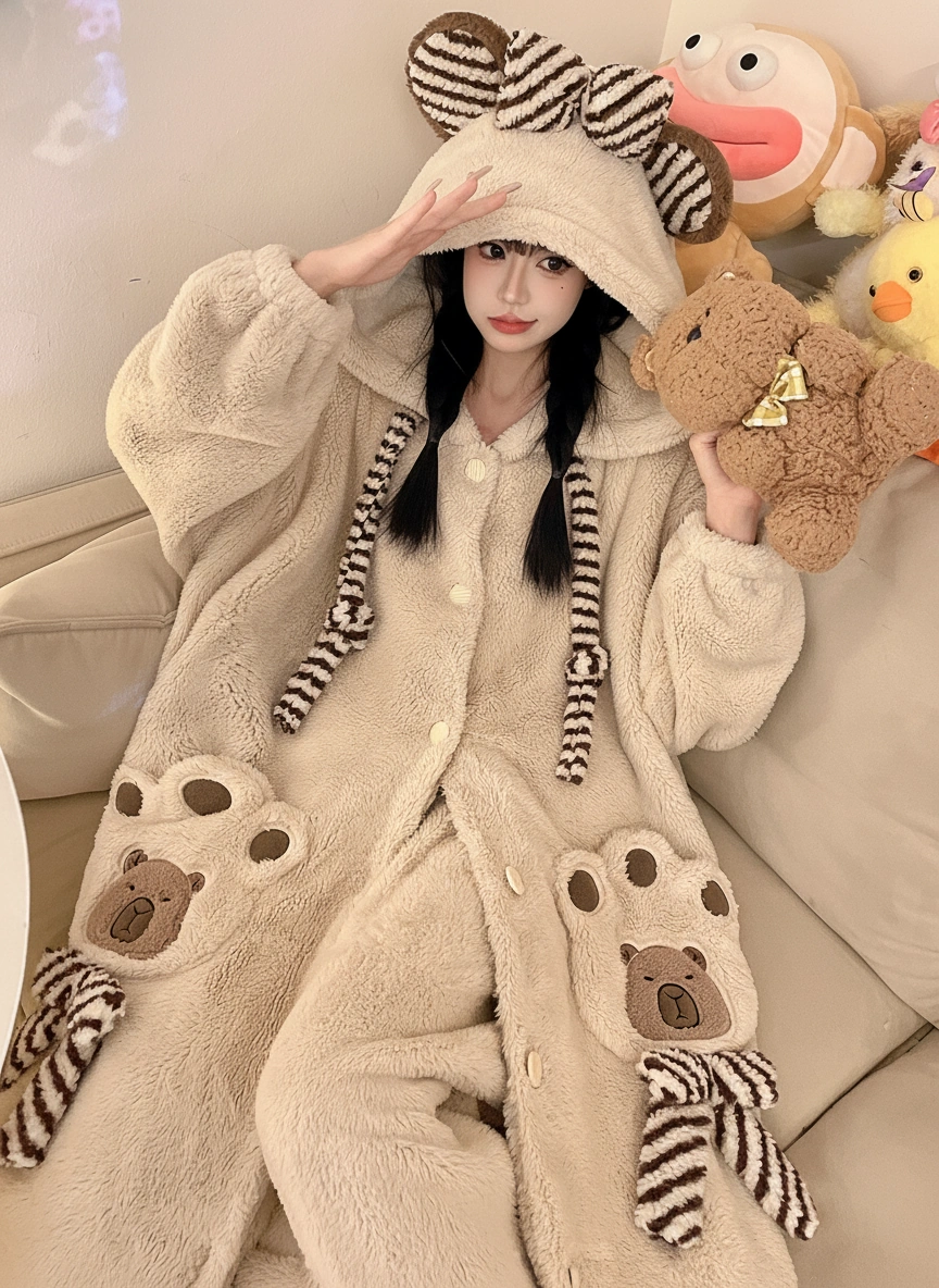 Kawaii Capybara Style Long Robe Pajama Set – Sherpa Fleece Hooded Cardigan – Striped Ribbon & Cute Paw Pockets Loungewear