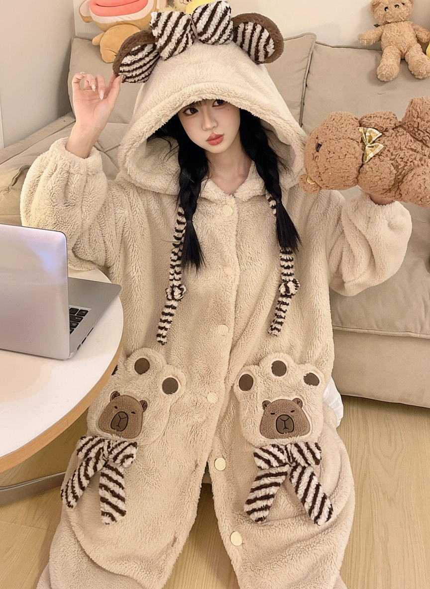 Stay incredibly warm this winter with this unique Kawaii Long Cardigan & Pant Pajama Set. Unlike traditional two-piece sets, this design features an extra-long, knee-length hooded jacket that doubles as a cozy house robe, perfect for channeling your inner relaxed Capybara.