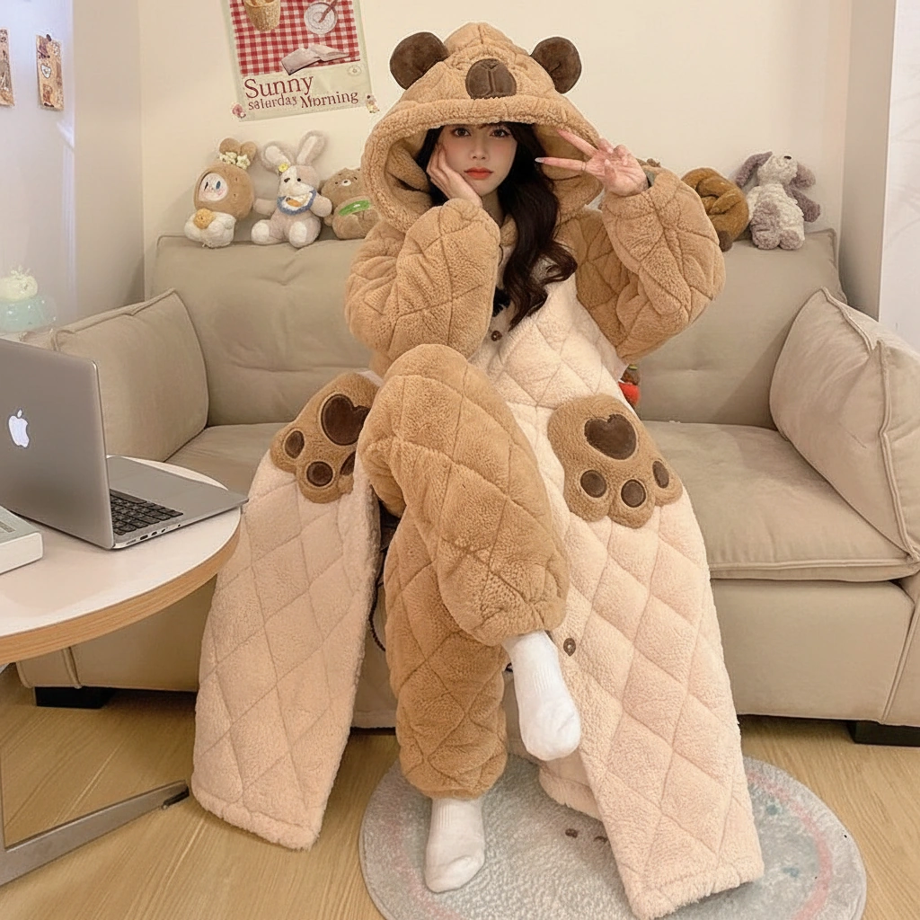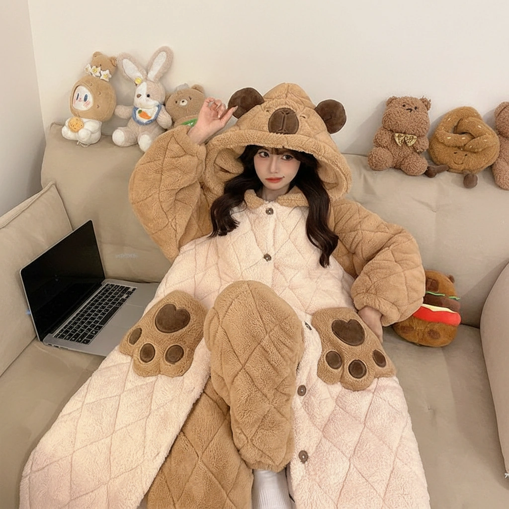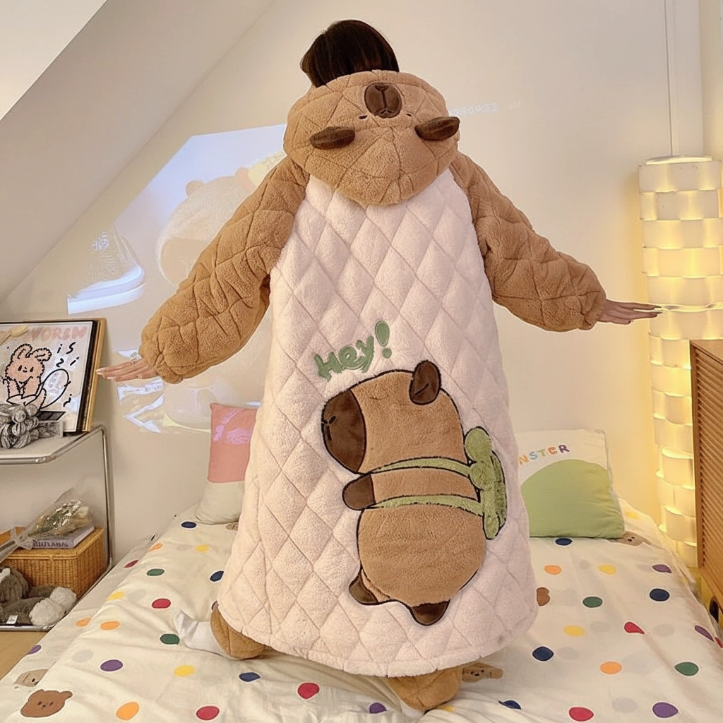 This set is essentially a walking sleeping bag. The quilted texture gives it a luxurious, puffy feel, while the turtle shell capybara on the back adds a unique personality. It represents the slow, steady, and comfortable life we all aspire to live in winter.