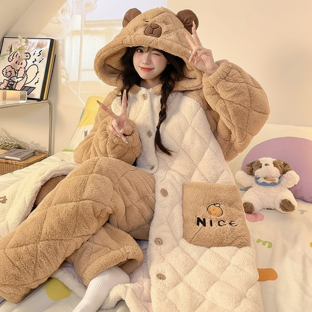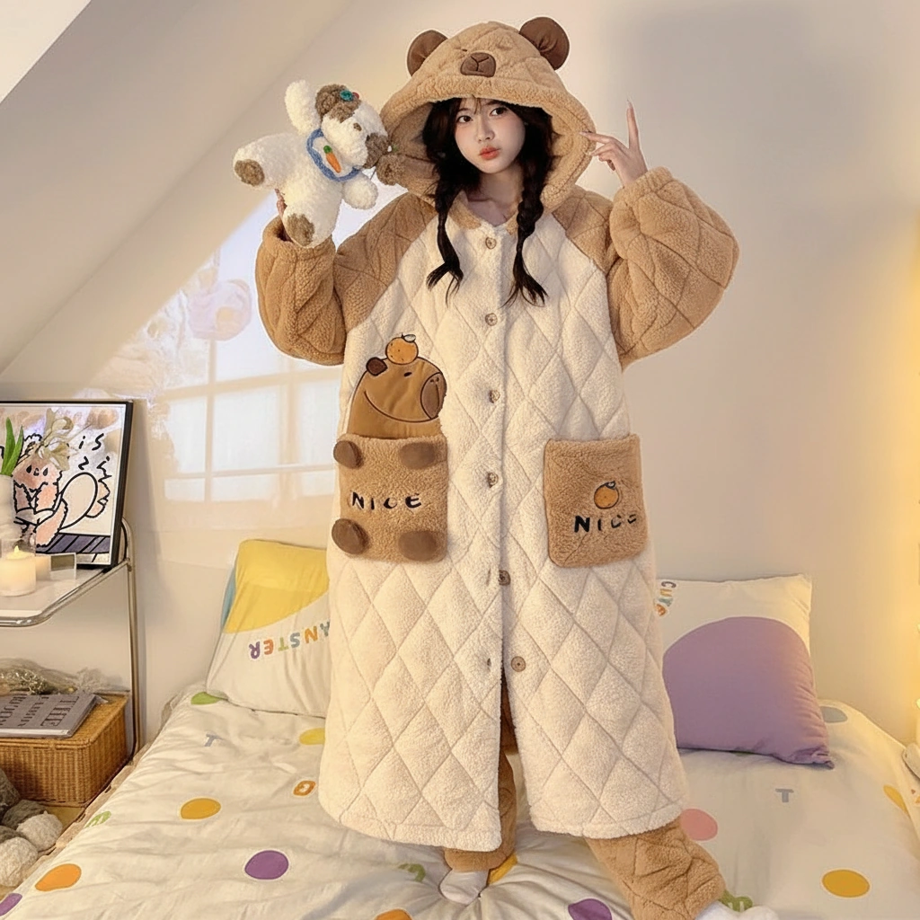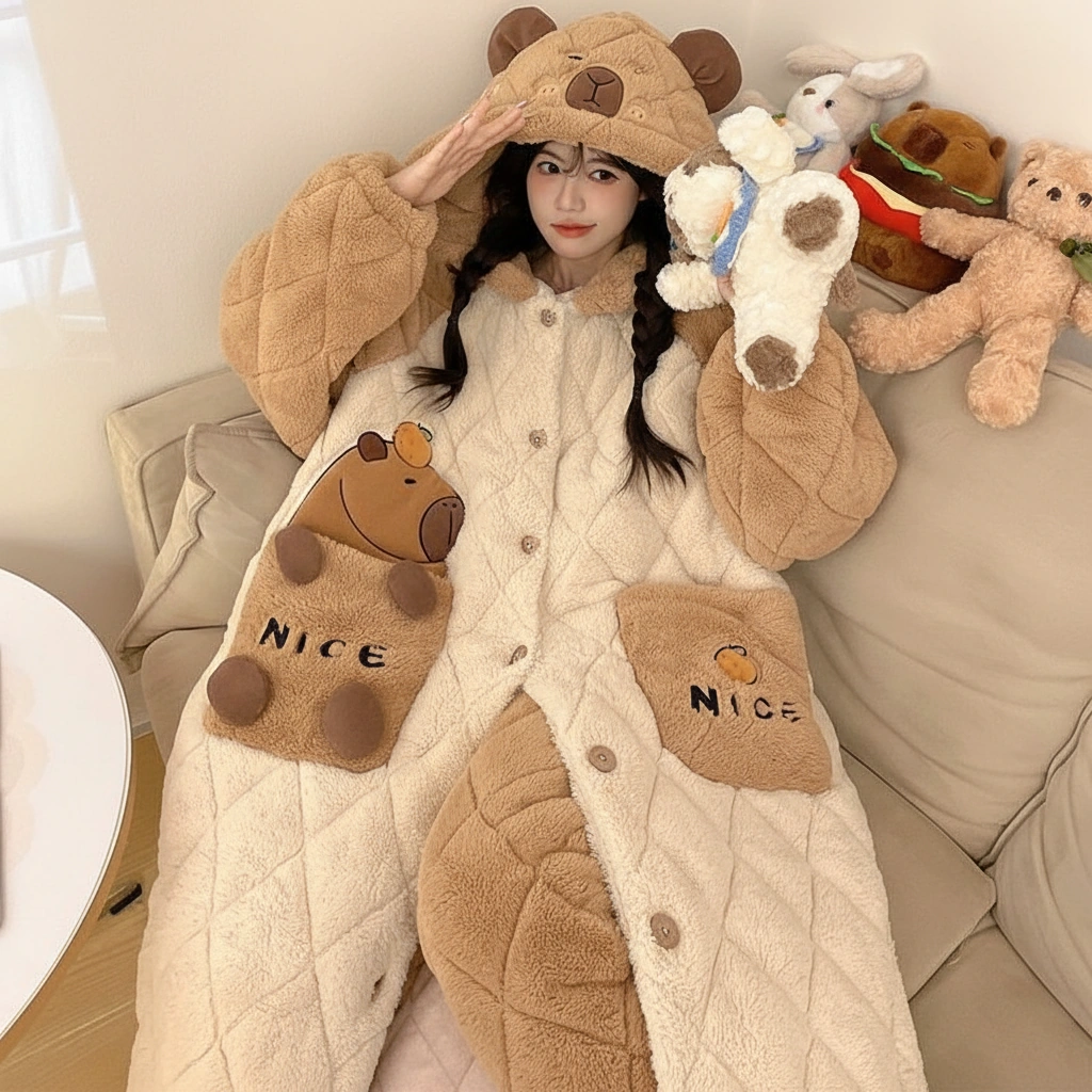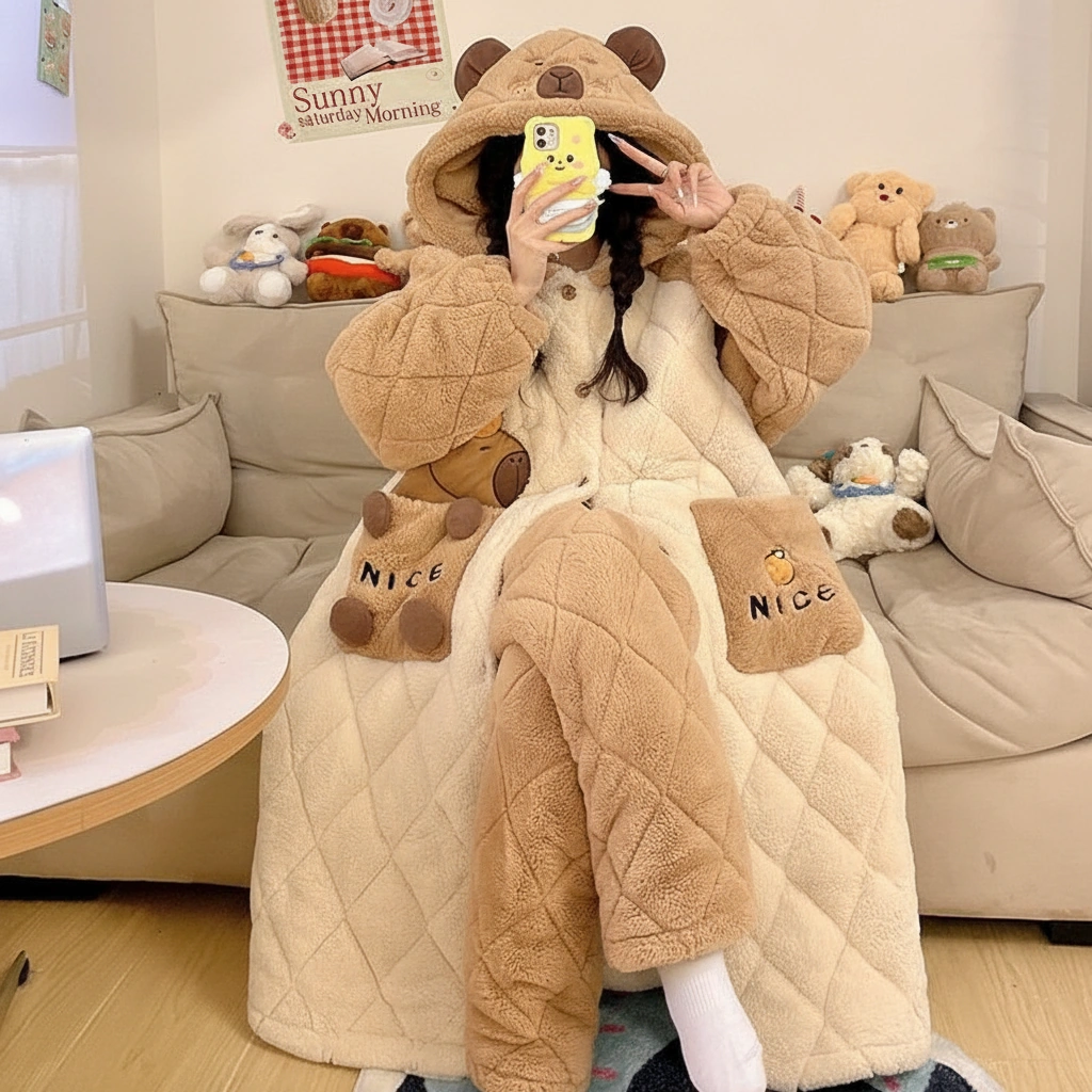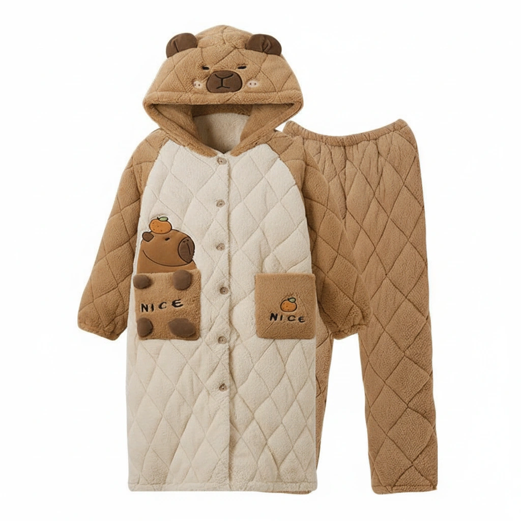 Why settle for a blanket when you can wear one that looks this cute? This capybara pajama set features an extra-long, coat-style top designed with a premium diamond-quilted texture. It combines the warmth of a winter coat with the softness of your favorite pajamas, making it the ultimate uniform for surviving the winter chill.
