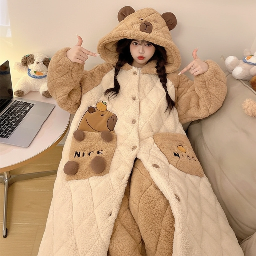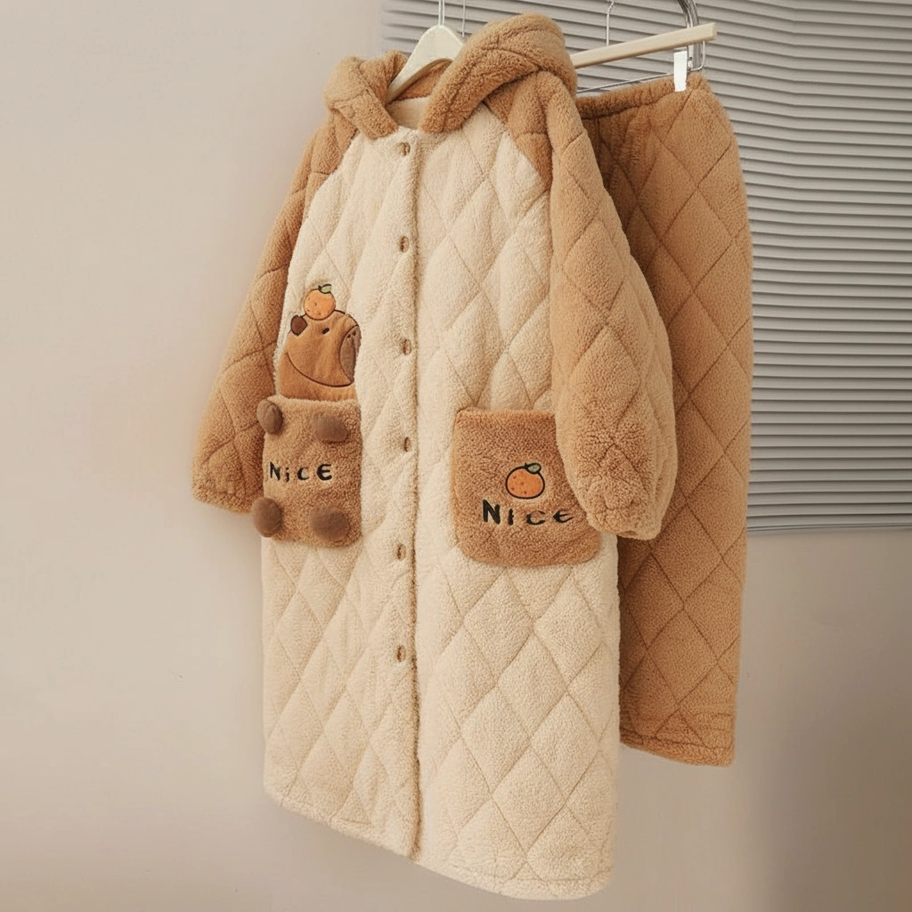 Capybara Pajamas Set – Long Diamond Quilted Fleece Hooded Robe Coat (2-Piece)