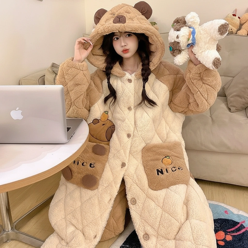 - Cute Hood: Finished with a fuzzy hood featuring bear/capybara ears and an embroidered face.
