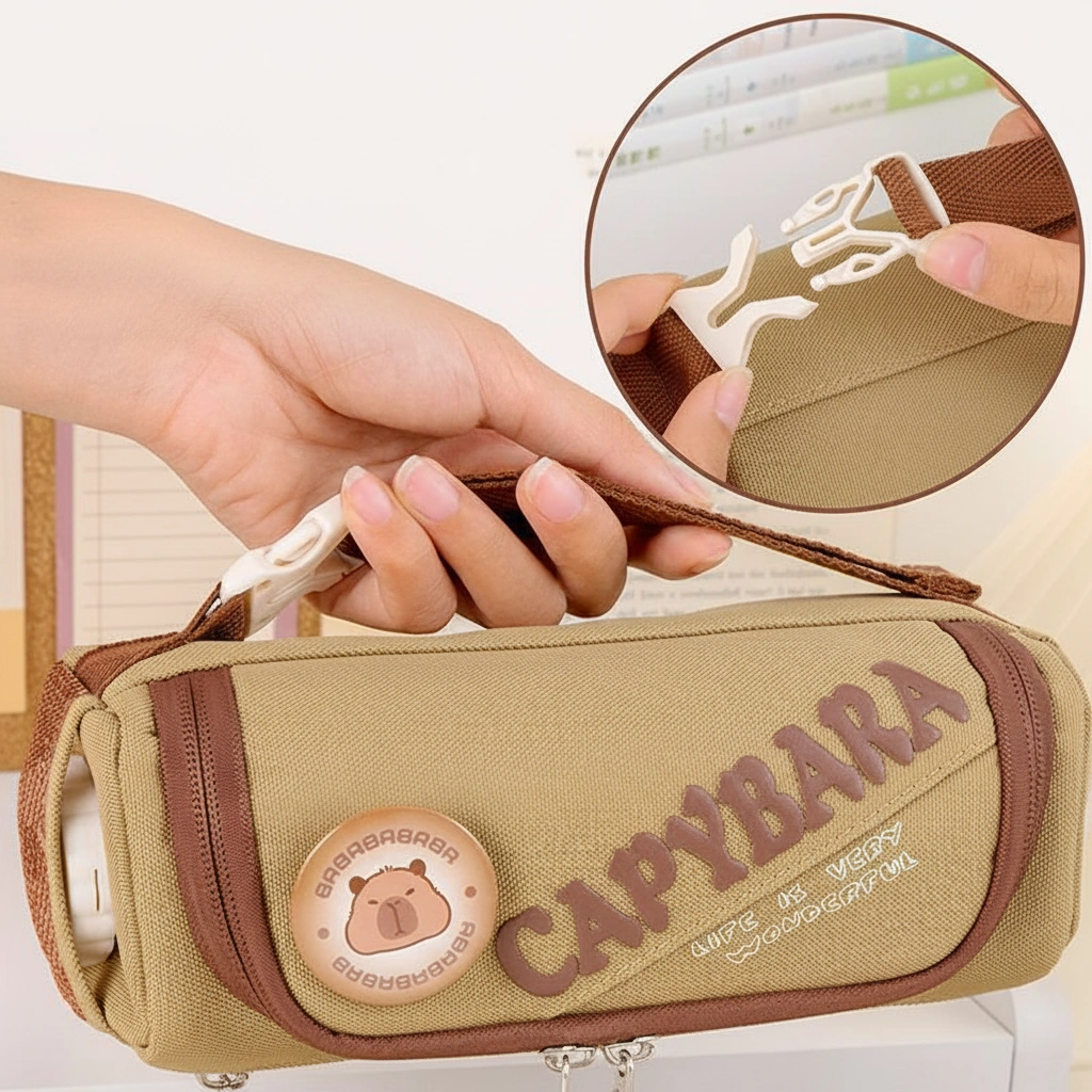 Capybara Utility Canvas Pencil Case (4 Colors) – Large Capacity Pouch with Clip-on Buckle Handle & Mesh Pockets