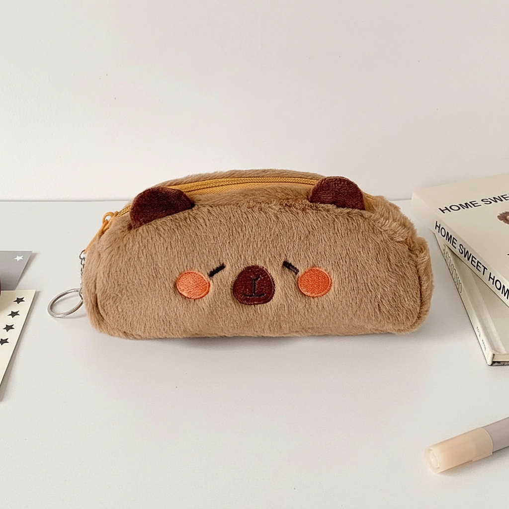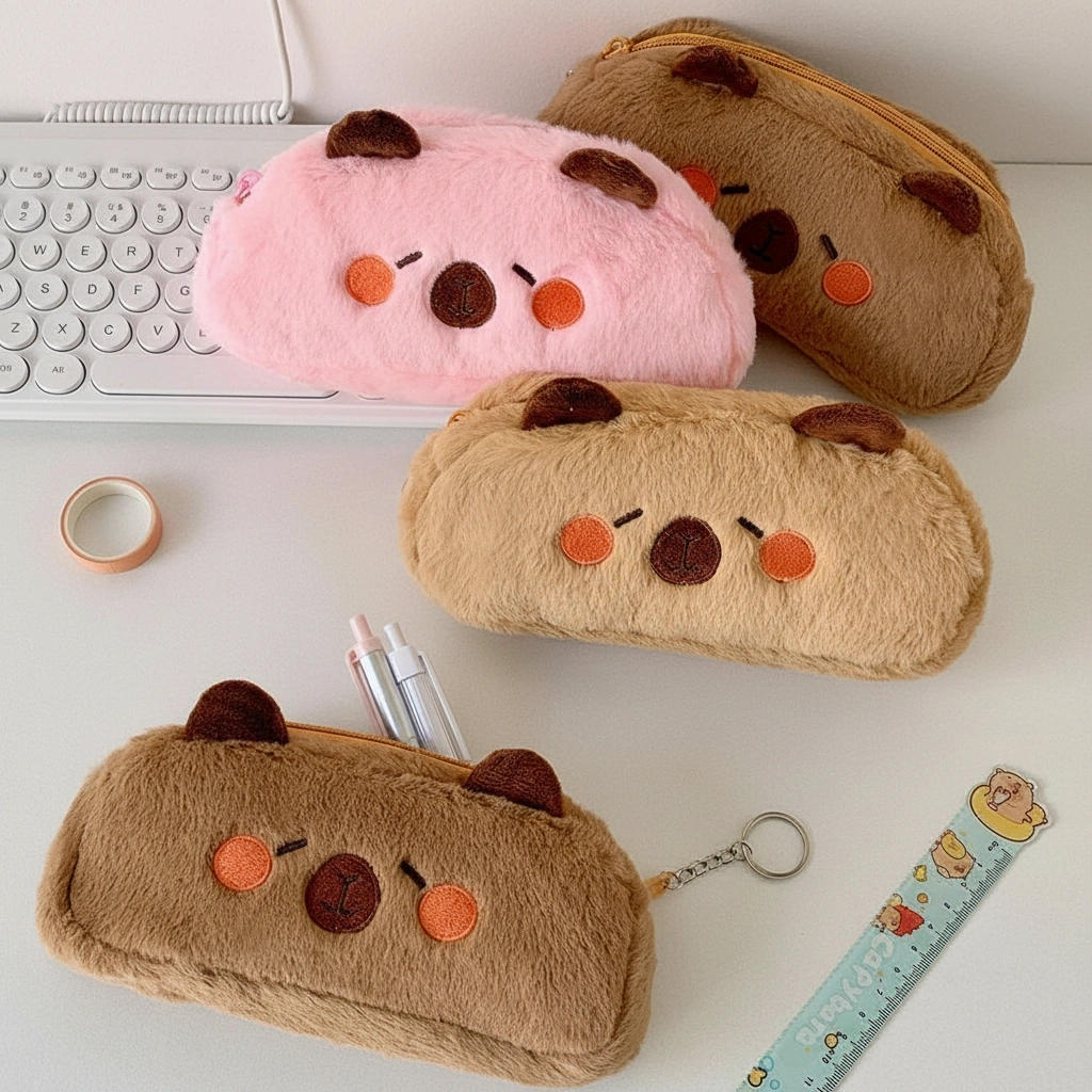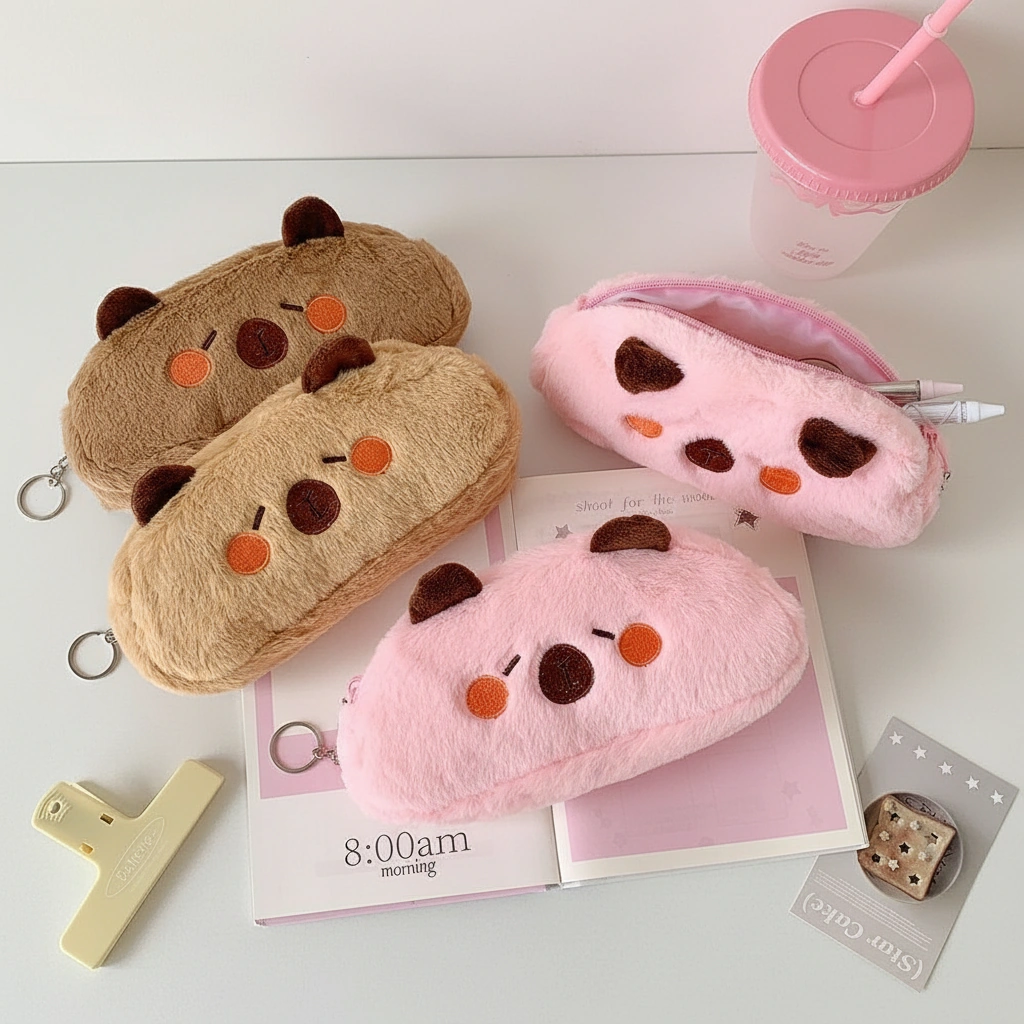 Soft Plush Capybara Pencil Case (3 Colors) – Fuzzy Stationery Pouch with Rosy Cheeks & Ring Zipper