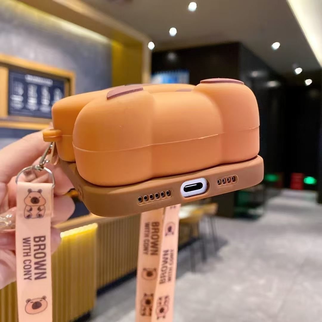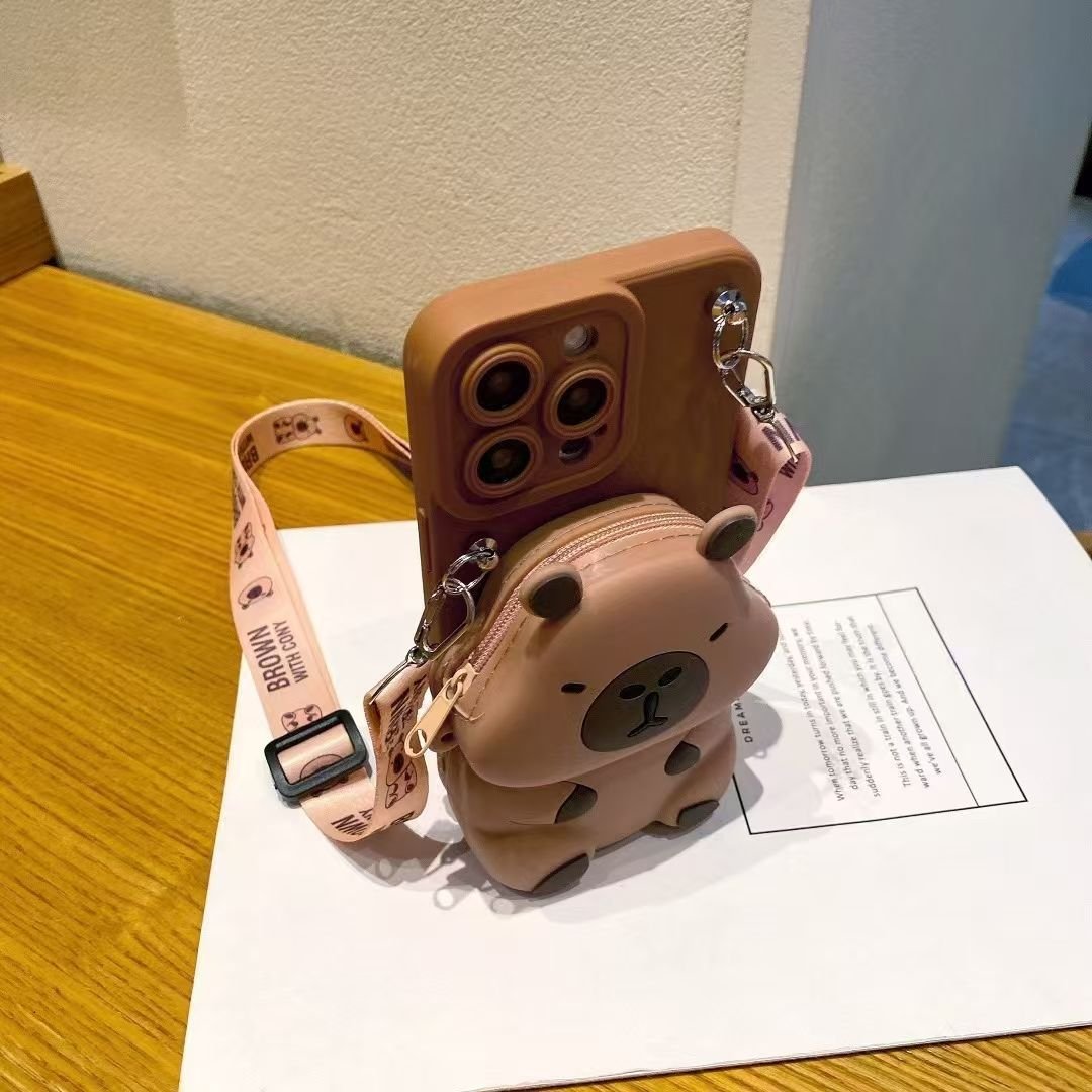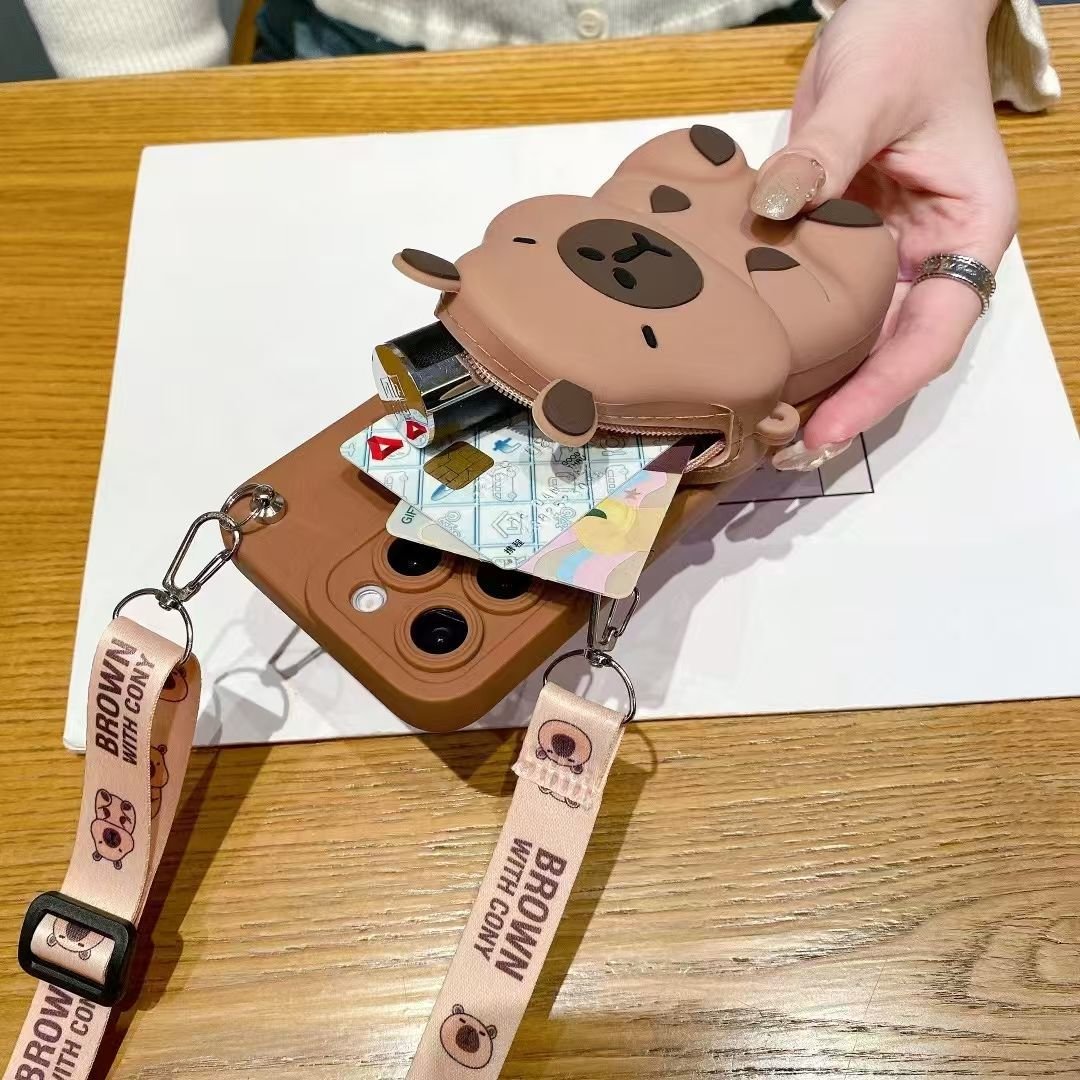 3D Capybara Wallet Phone Case with Crossbody Strap (2 Colors) – Silicone Zipper Pouch Cover