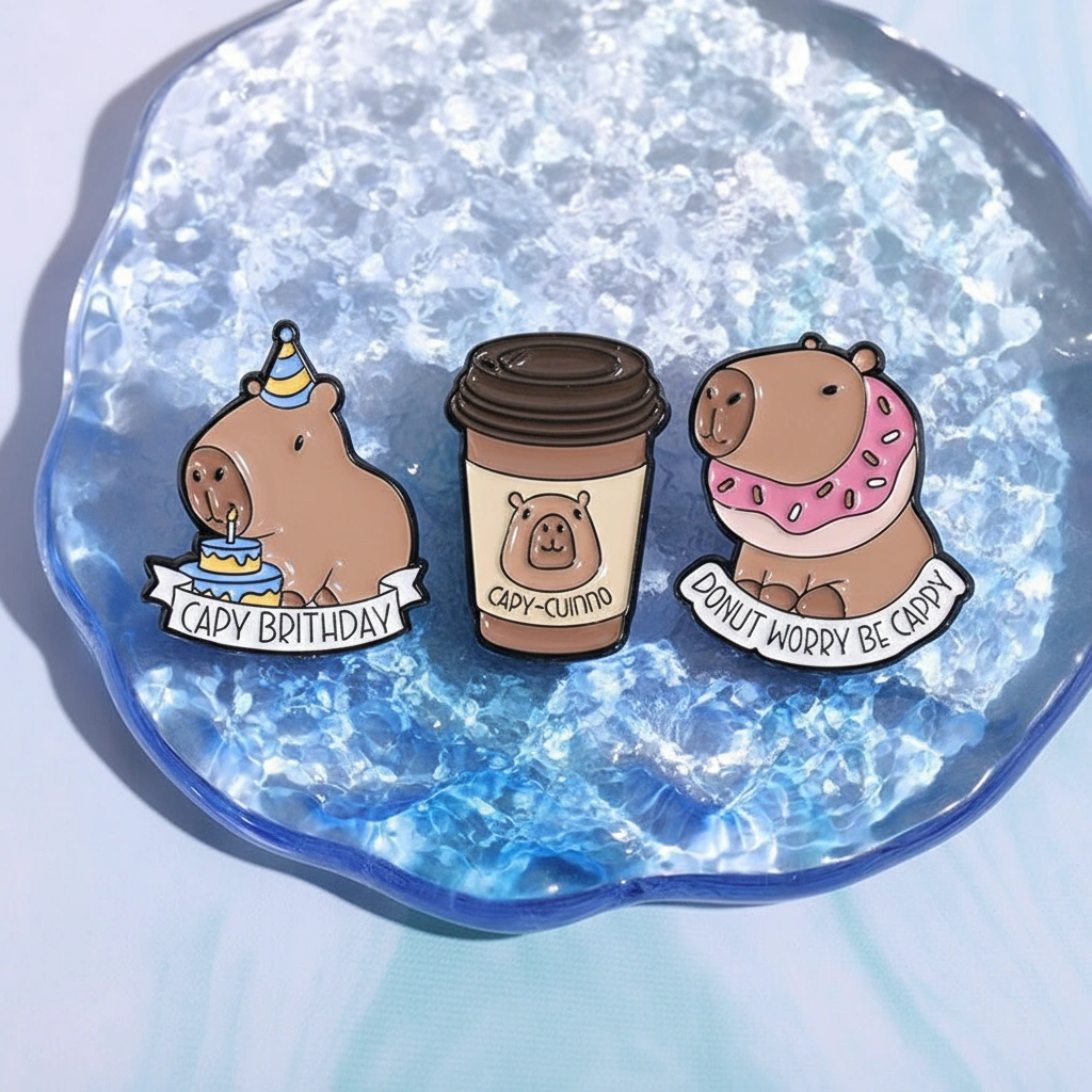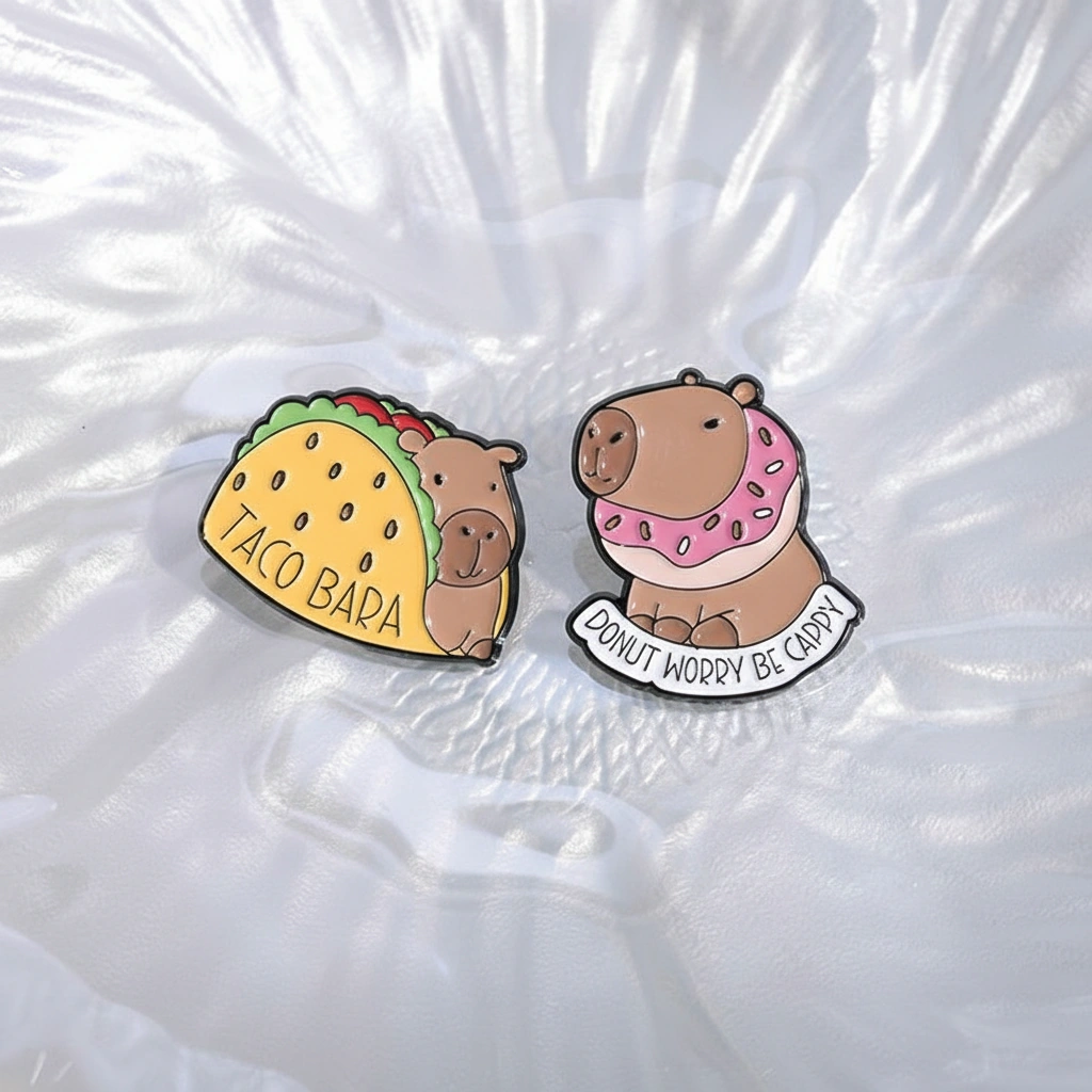 A Feast of Puns Combine your love for snacks and witty wordplay with this delicious five-piece enamel pin collection. This set transforms the chill capybara into your favorite comfort foods, serving up a menu of hilarious puns that are sure to make people hungry and happy. Whether you are a coffee addict, a taco tuesday enthusiast, or celebrating a special day, these badges add a flavorful touch to aprons, lunch bags, or casual wear.