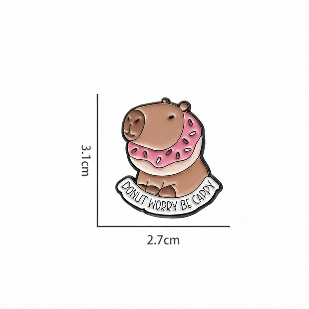 • The Sweet Optimist: A capybara wearing a pink frosted donut with sprinkles, reminding you to “DONUT WORRY BE CAPPY”.