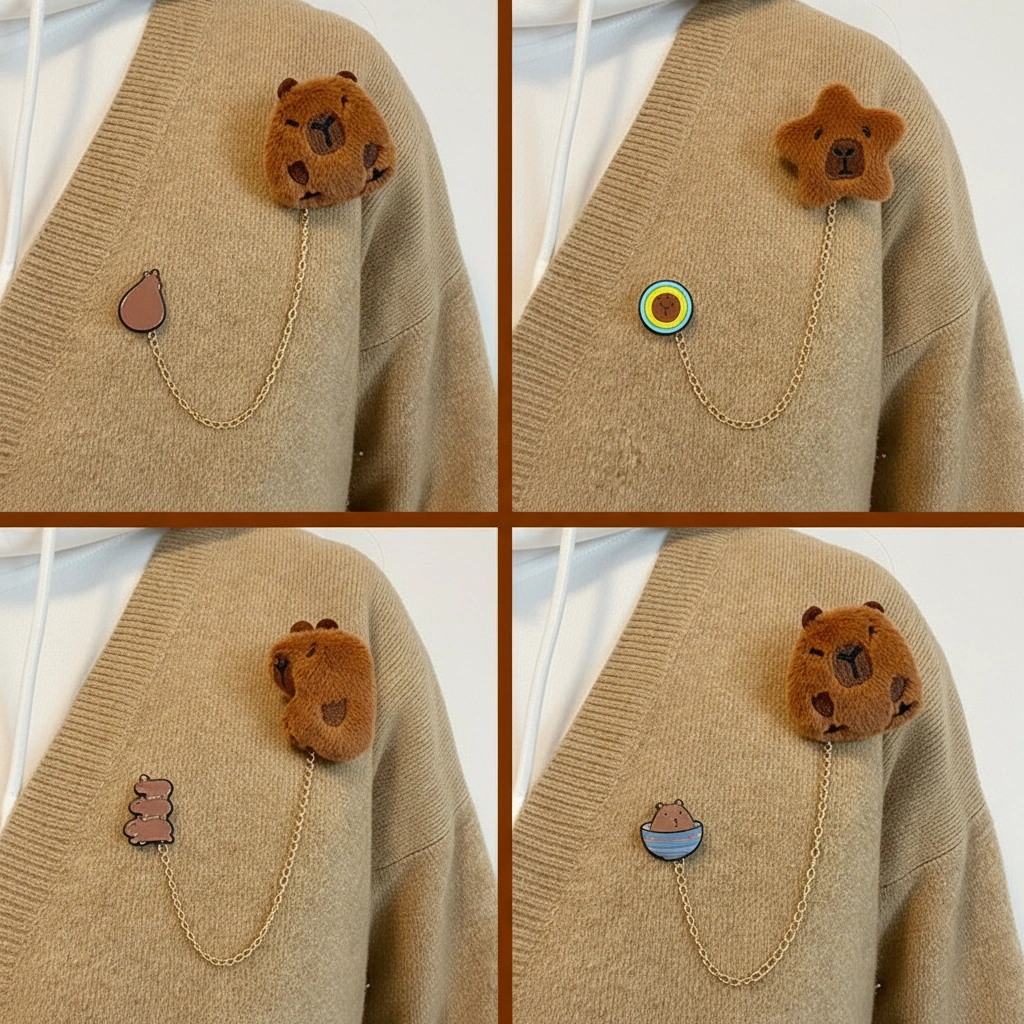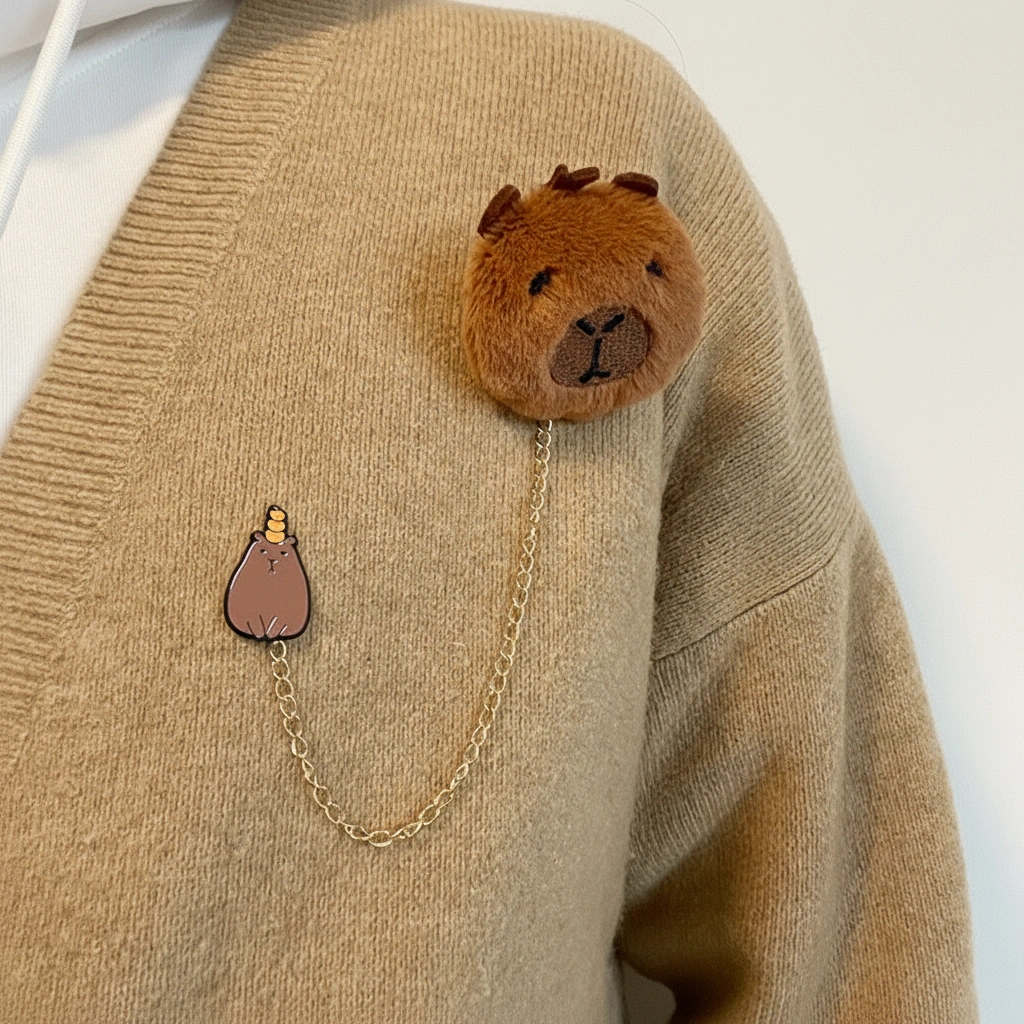 Product Description Soft, Fuzzy, and Double the Fun Why choose between a plushie and a pin when you can have both? This unique accessory combines the cozy texture of a soft toy with the sleek finish of an enamel pin, all connected by a stylish gold-tone chain. The main attraction is a fuzzy, 3D capybara head that adds immediate dimension to your outfit, while the smaller hanging charm adds a touch of storytelling. It is a creative way to decorate cardigans, lapels, or collar tips, creating a draped chain effect that looks great on any fabric.