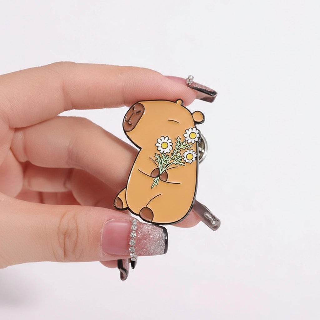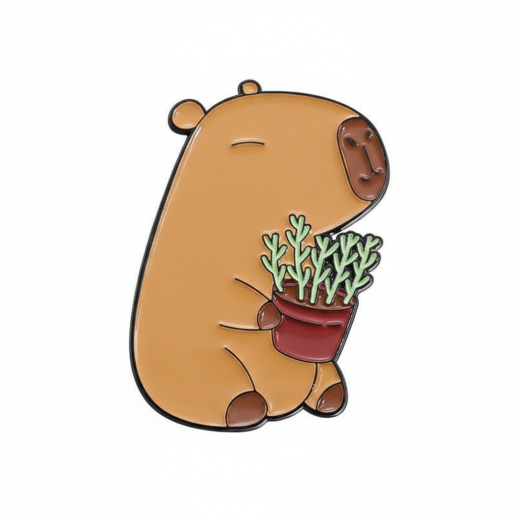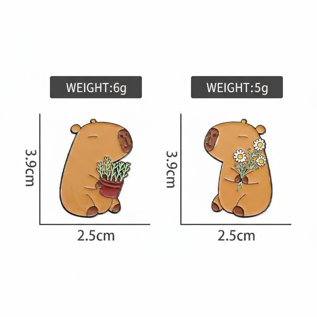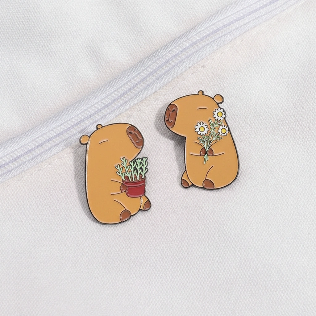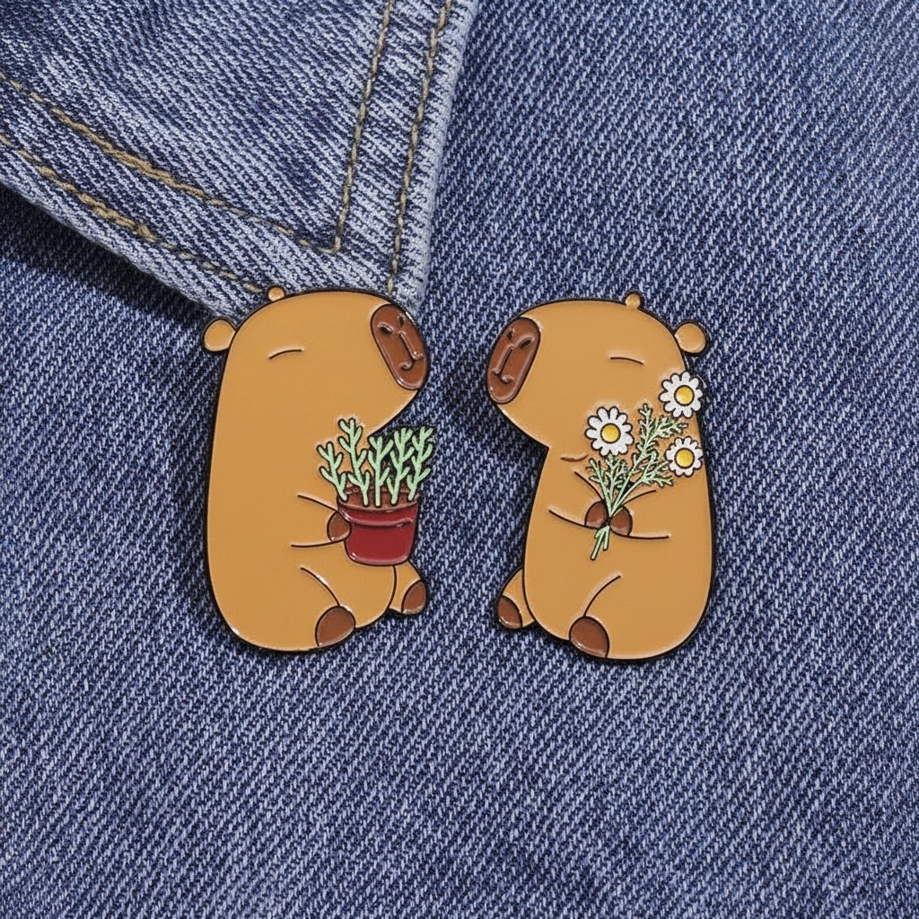 A Wholesome Dose of Nature Bring a touch of the “soft life” to your accessories with this adorable nature-themed pin set. These two capybaras are taking a break from swimming to enjoy the garden. Whether you have a green thumb or just love fresh blooms, this duo captures the gentle and nurturing side of the world’s friendliest rodent. They look especially cute when pinned on tote bags, aprons, or sun hats.