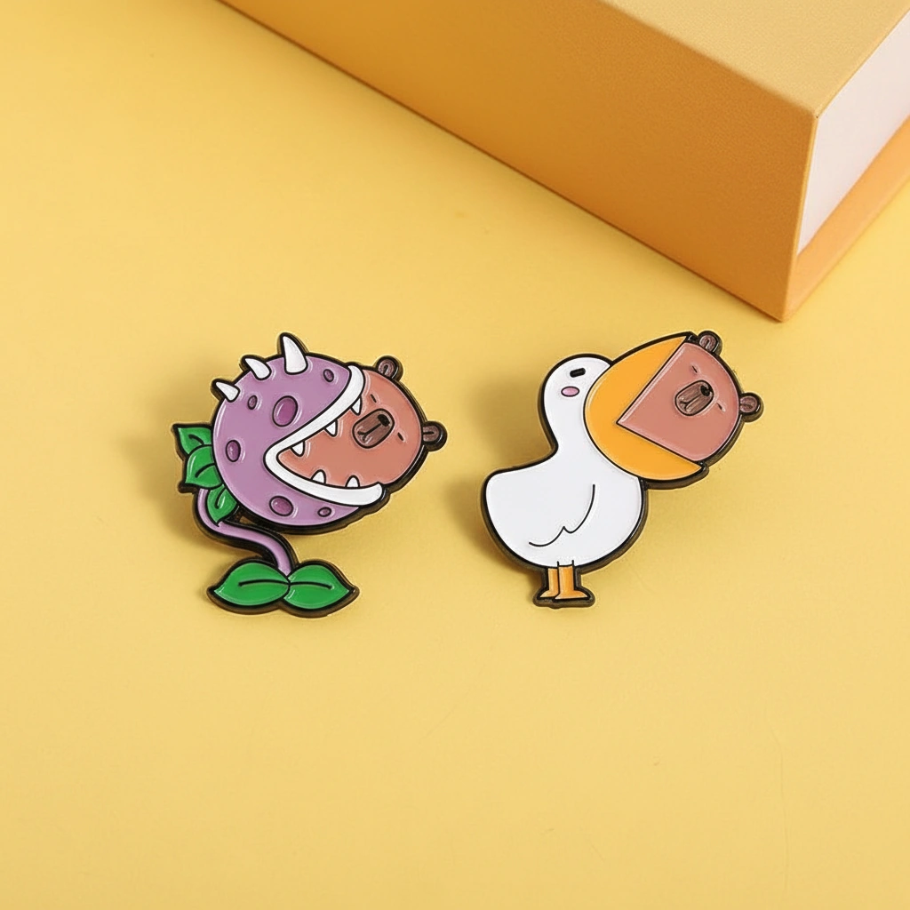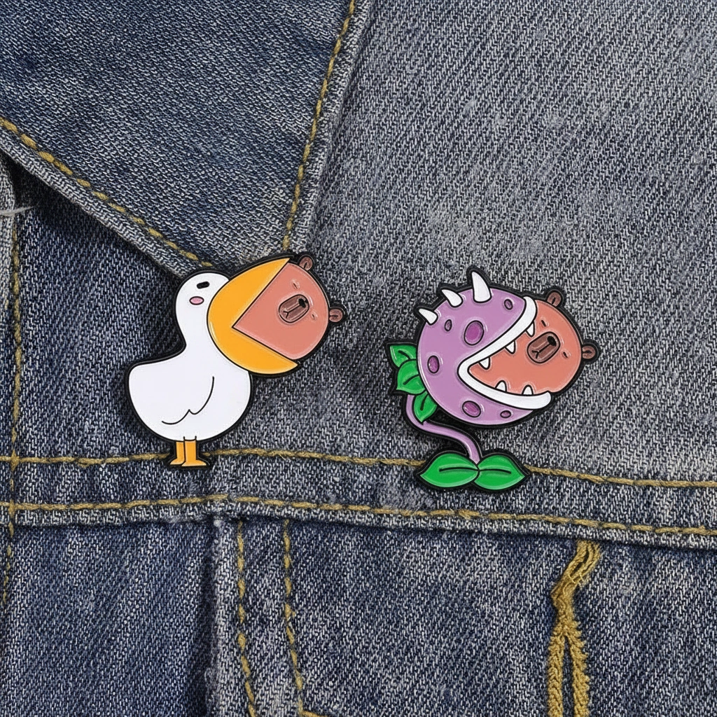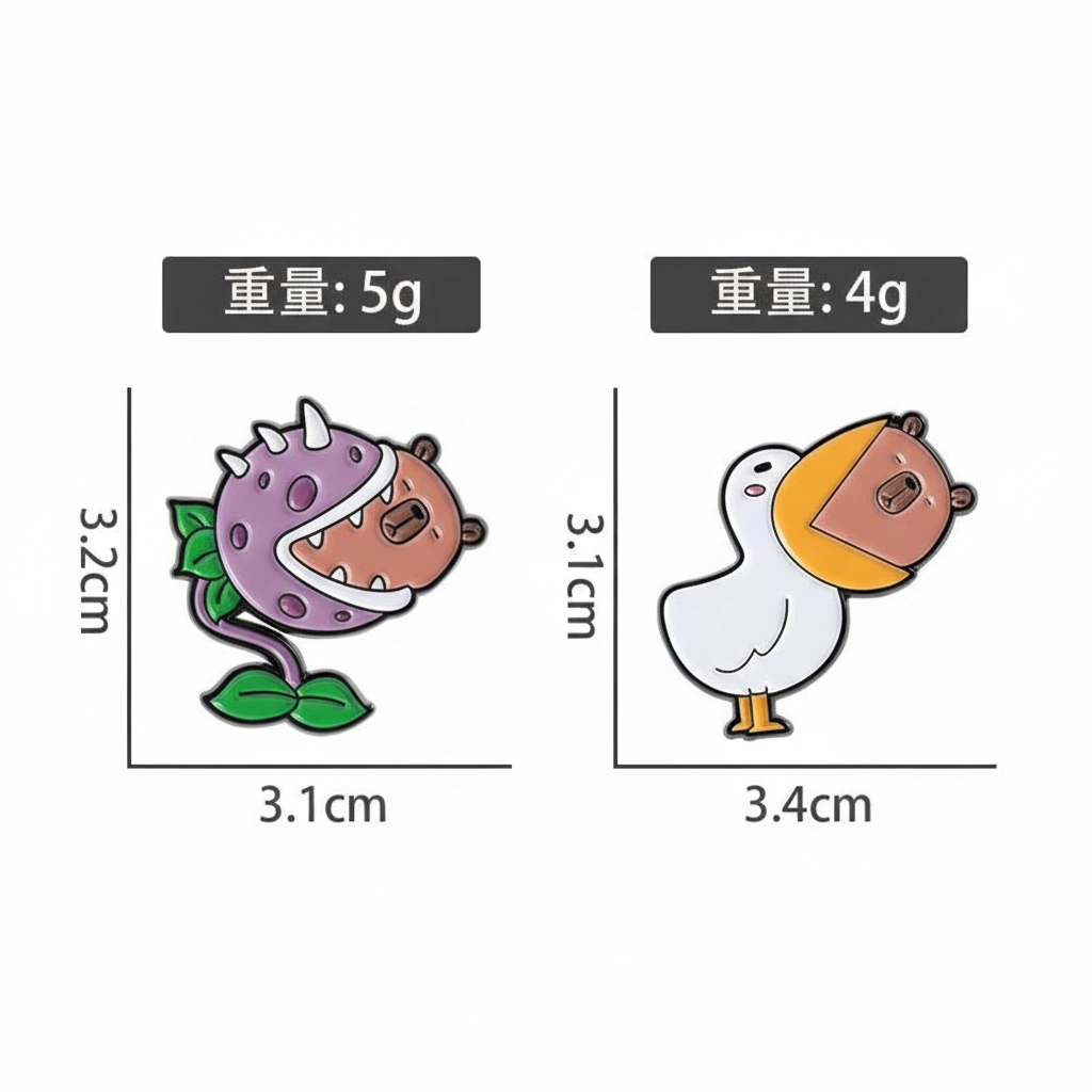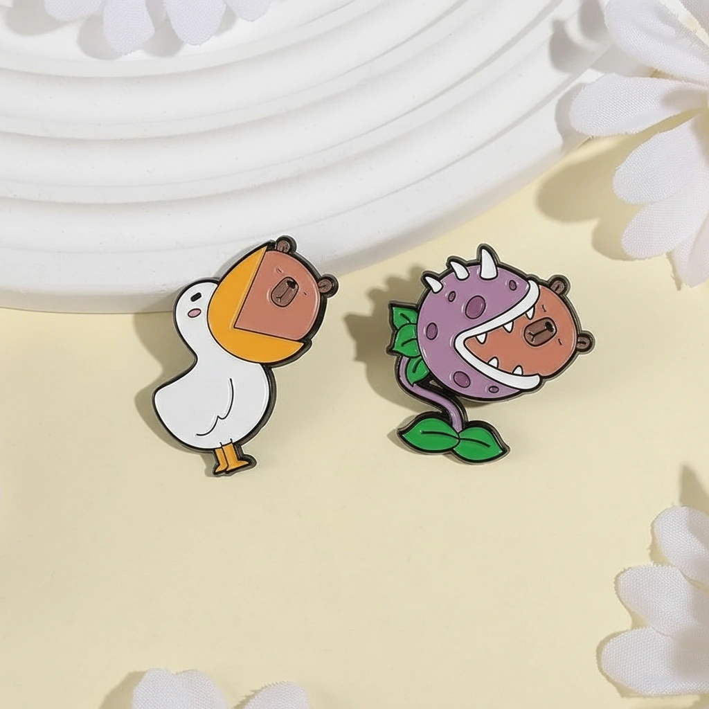 2pcs Capybara Pin Set – Funny Pelican & Carnivorous Plant Biting Meme Badges