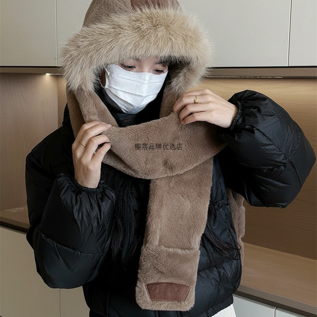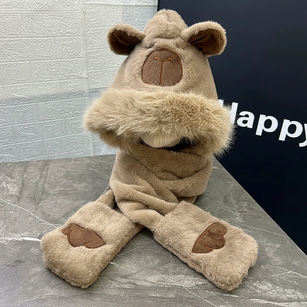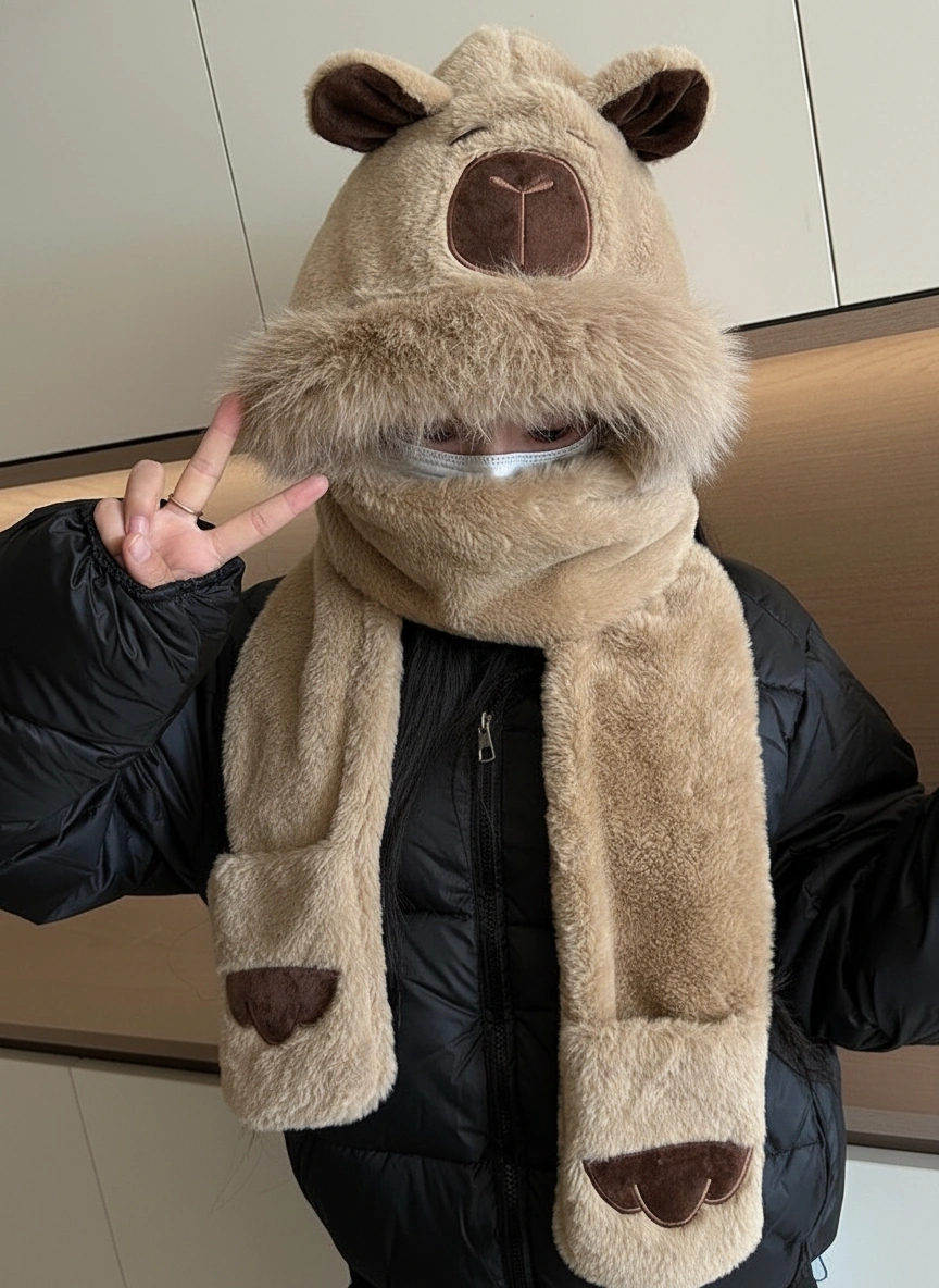 Adult Capybara 3-in-1 Hooded Scarf with Gloves – Faux Fur Trim (3 Colors)